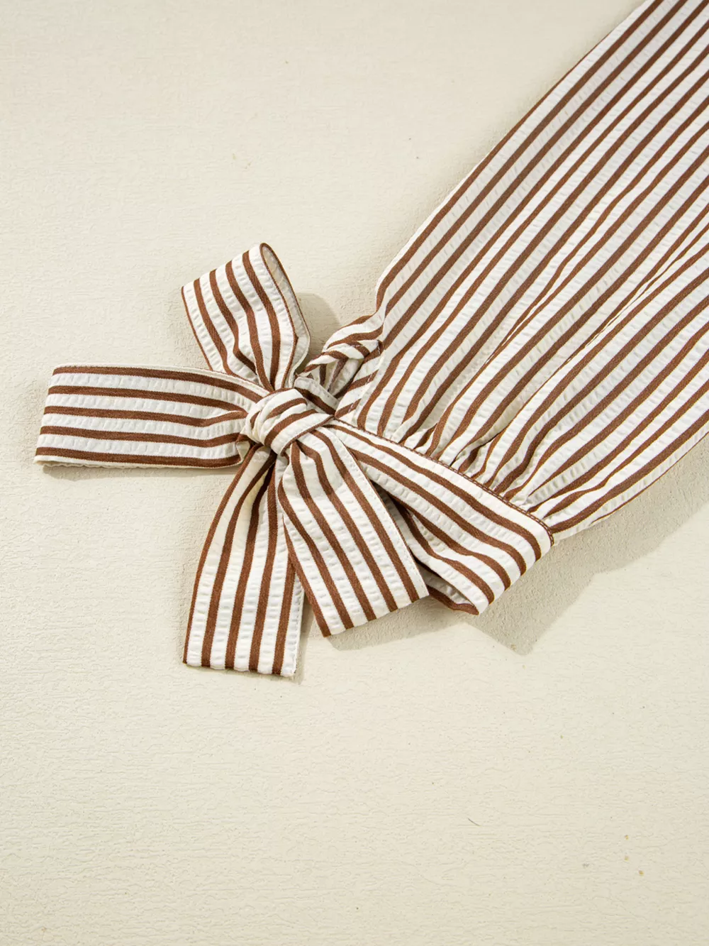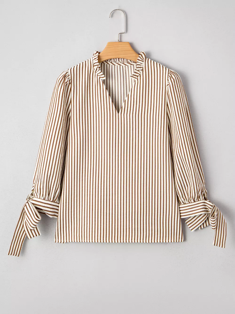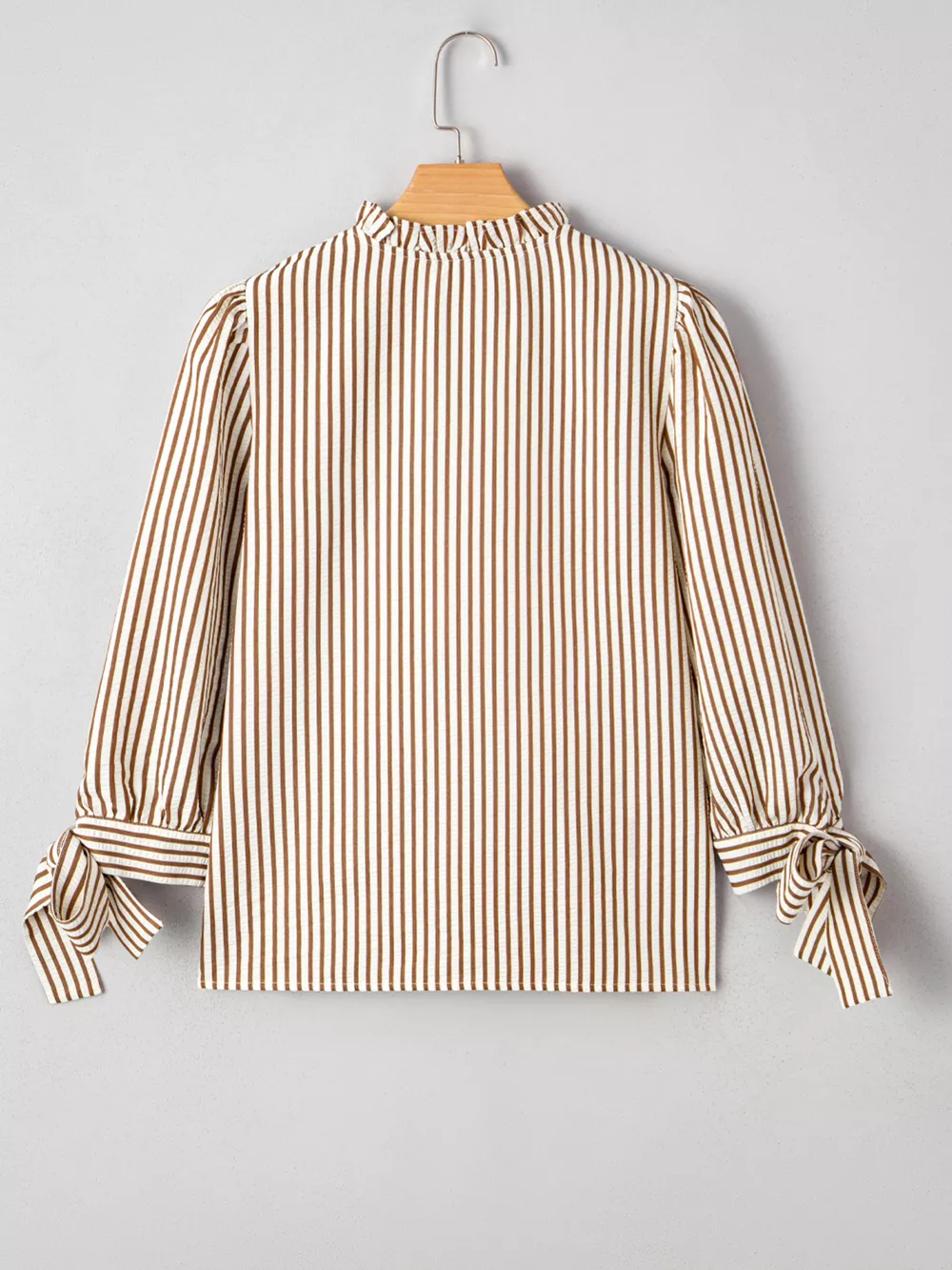 Striped Ruffled Neck Blouse with Tie Sleeves