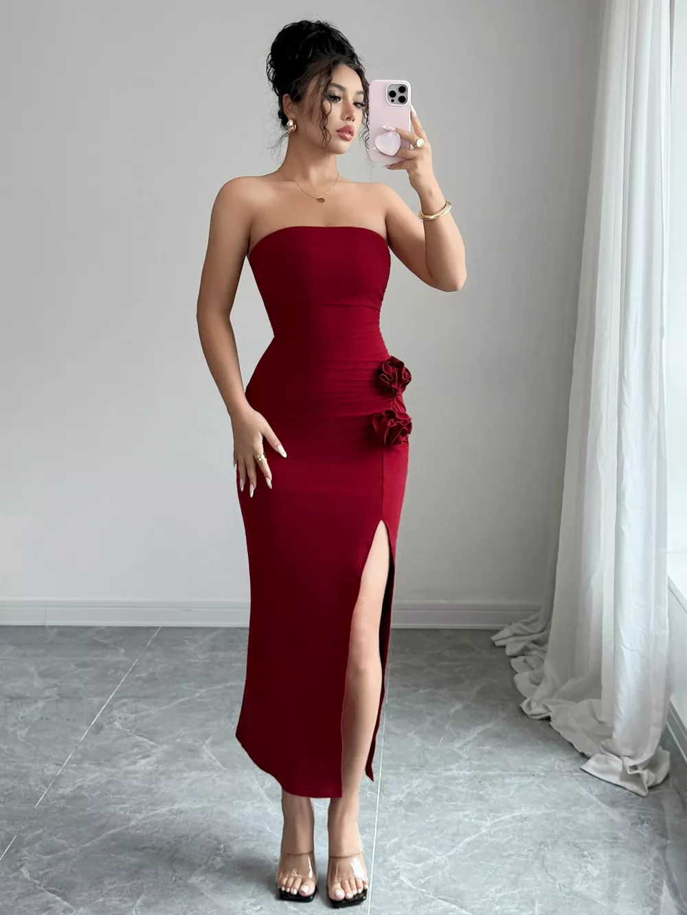 Front Split Strapless Dress with Floral Detail