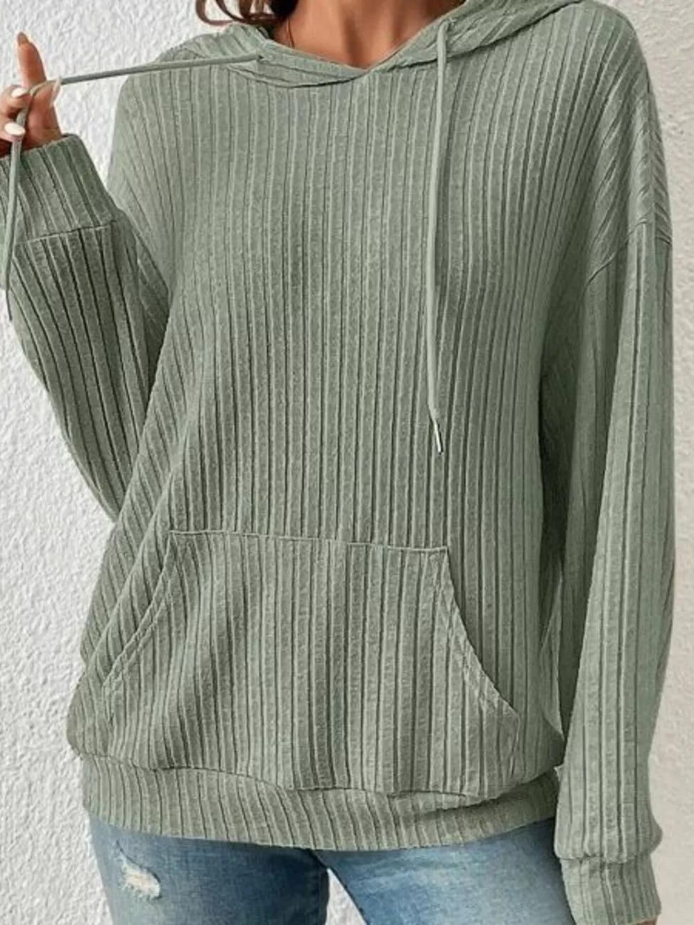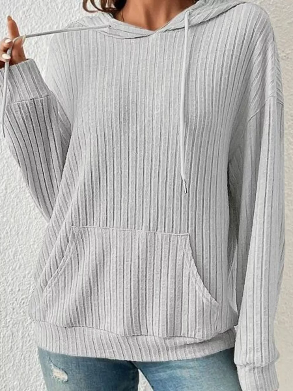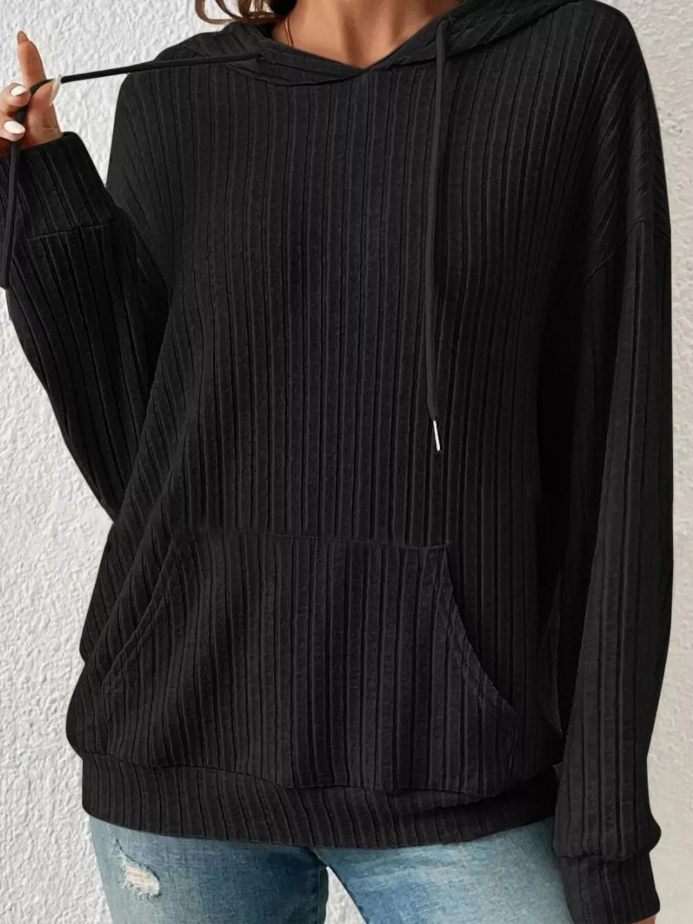 Ribbed Knit Long Sleeve Drawstring Hoodie