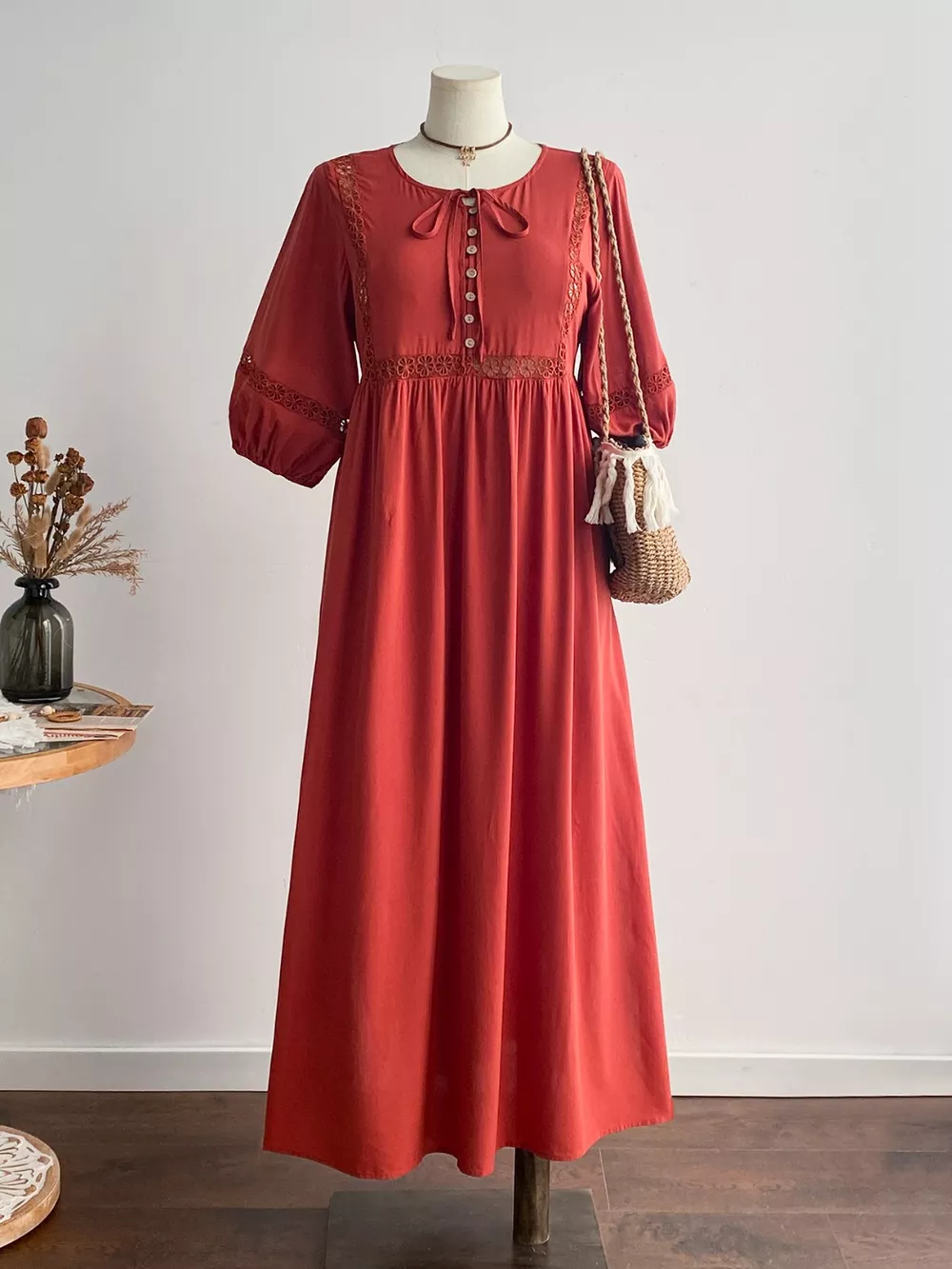 Plus Size Tie Neck Puff Sleeve Midi Dress with Lace Trim