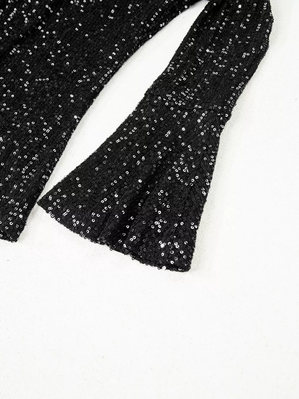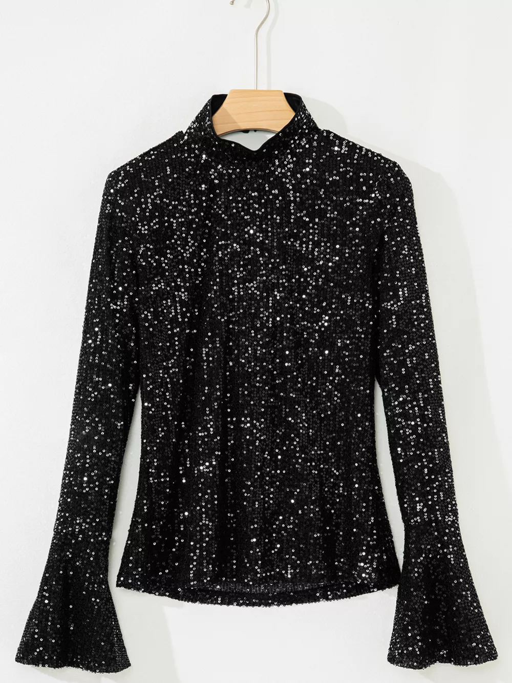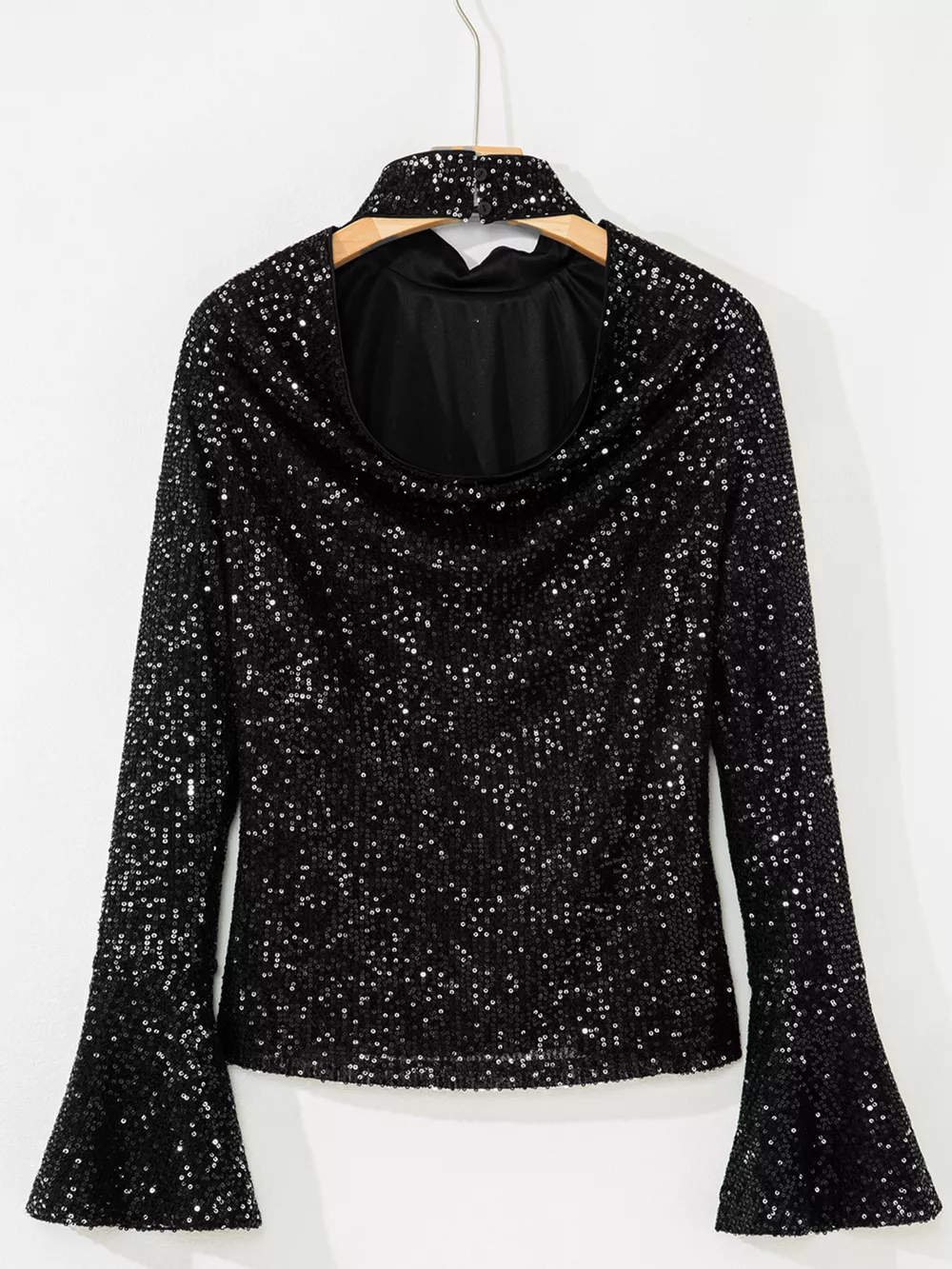 Sequin Mock Neck Drape Open Back Bell Sleeve Top