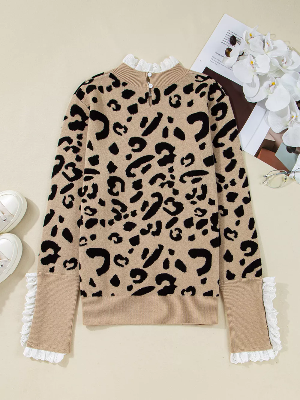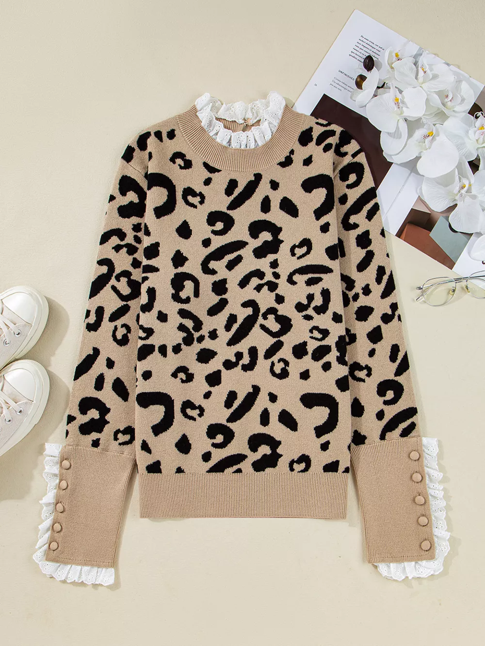 Leopard Pattern Lace Ribbed Detail Button Cuffed Sweater