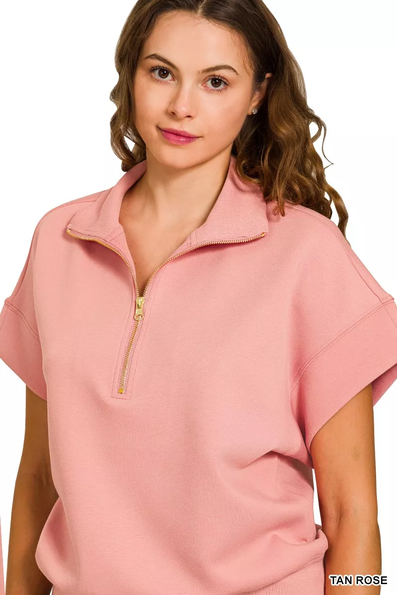Zenana Full Size Scuba High Neck Half Zip Short Sleeve Top Plus Size
