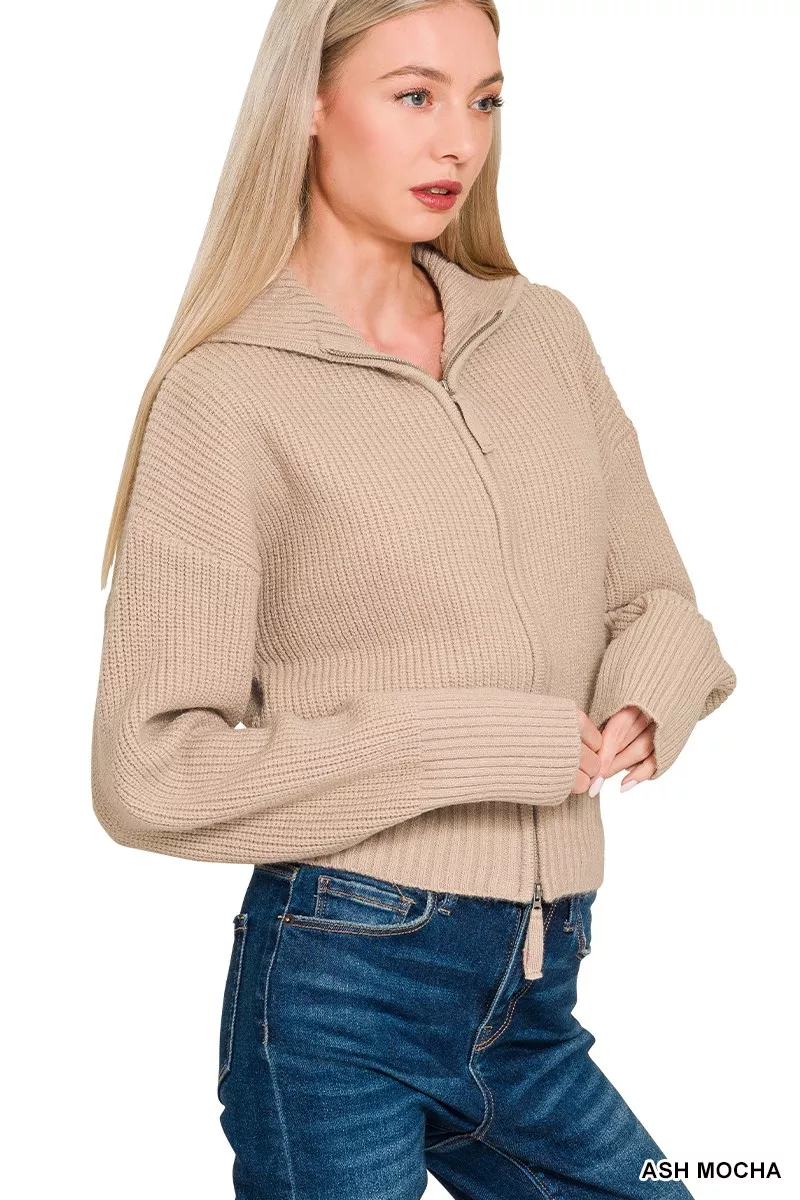 Zenana Ribbed Collared Zip Up Sweater Cardigan