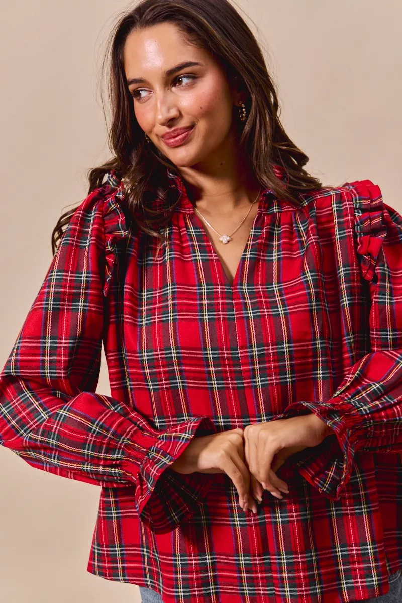 SO ME Christmas Checkered Plaid Smocked Blouse