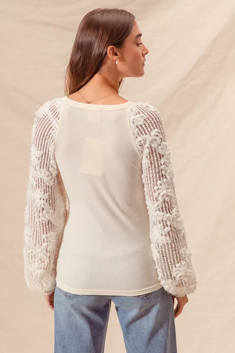 SO ME Rib Knit Top with Lace Balloon Sleeves