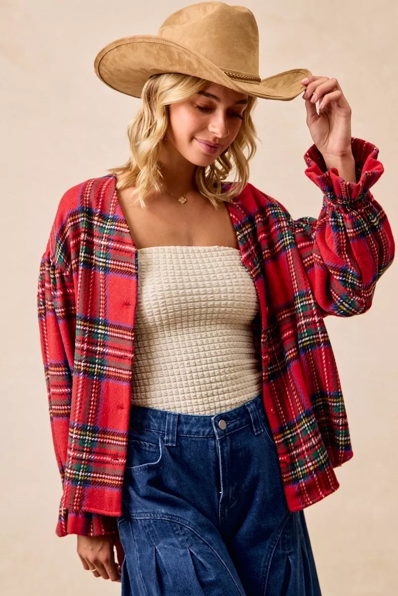 Detailed description of the BiBi Christmas Plaid V-Neck Flounce Sleeve Jacket, highlighting quality, design, and unique features that make it appealing to end consumers.