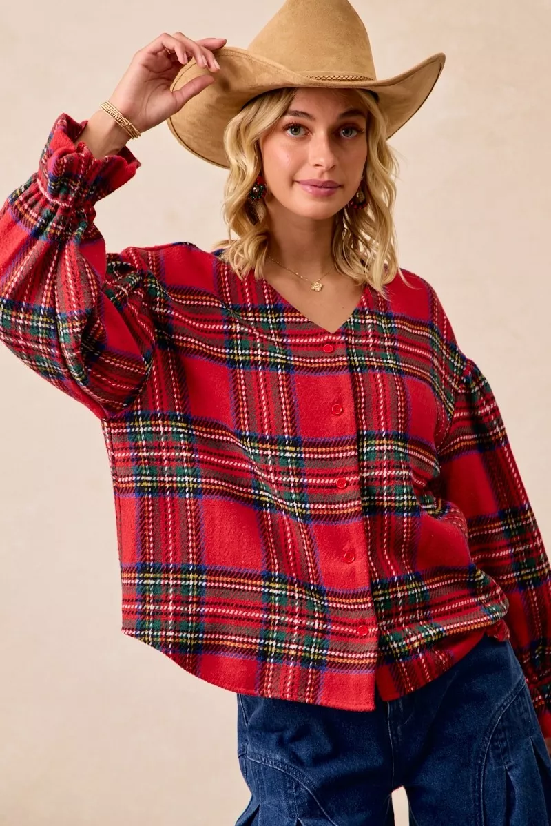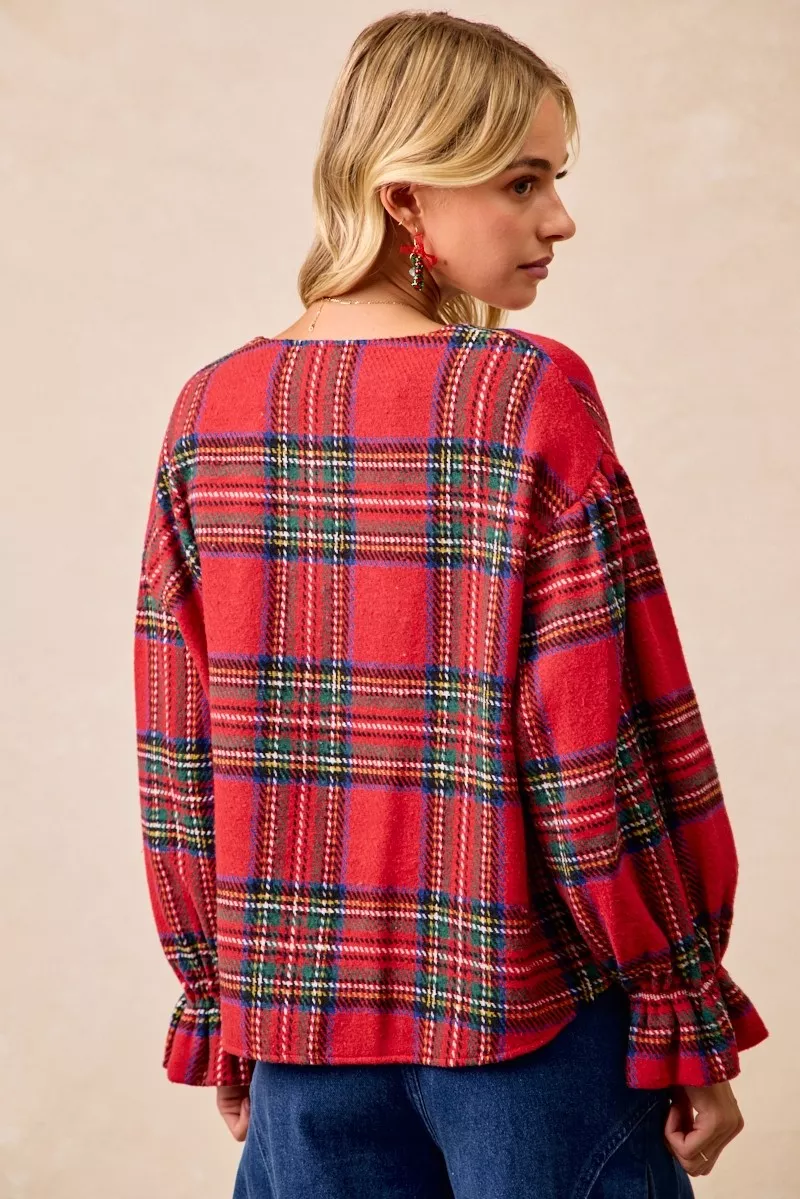 BiBi Christmas Plaid V-Neck Flounce Sleeve Jacket