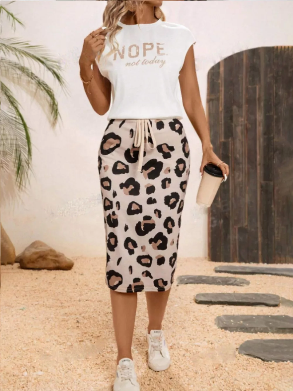 Letter Round Neck Cap Sleeve Top and Leopard Skirt Set