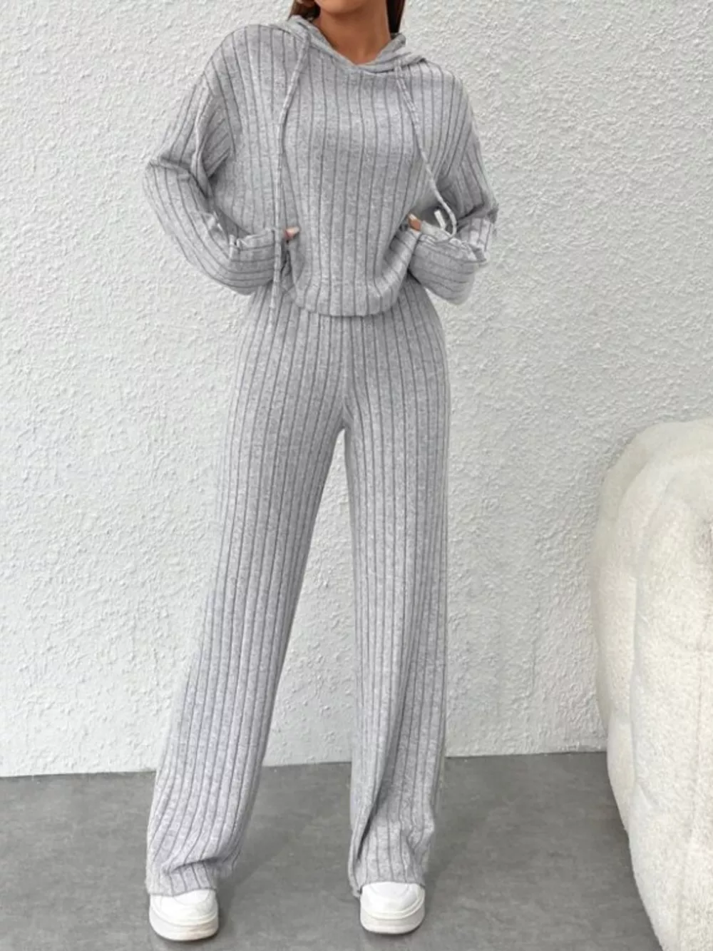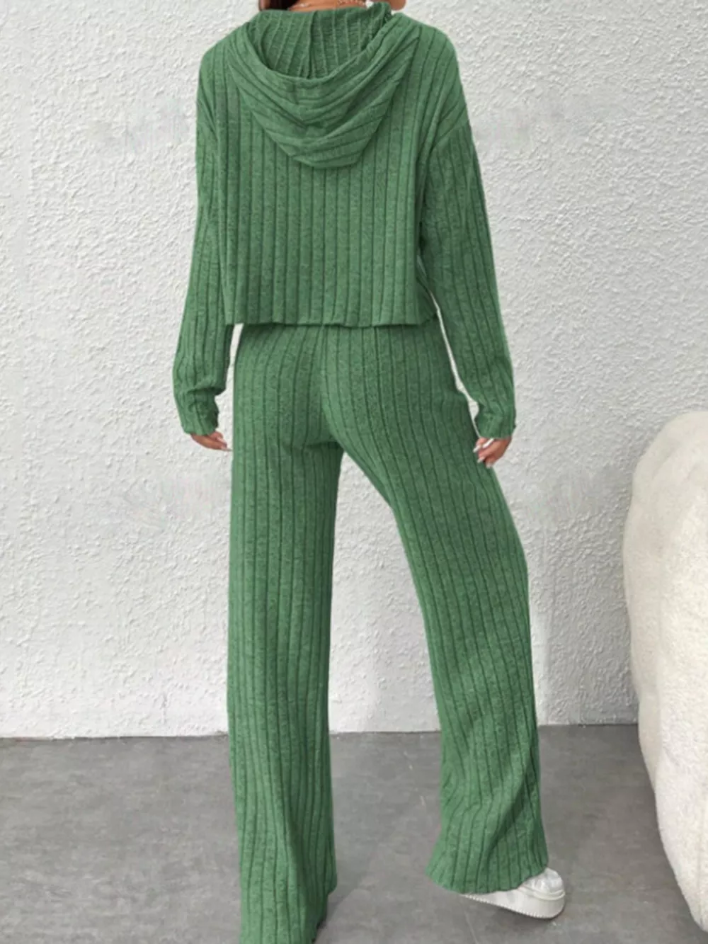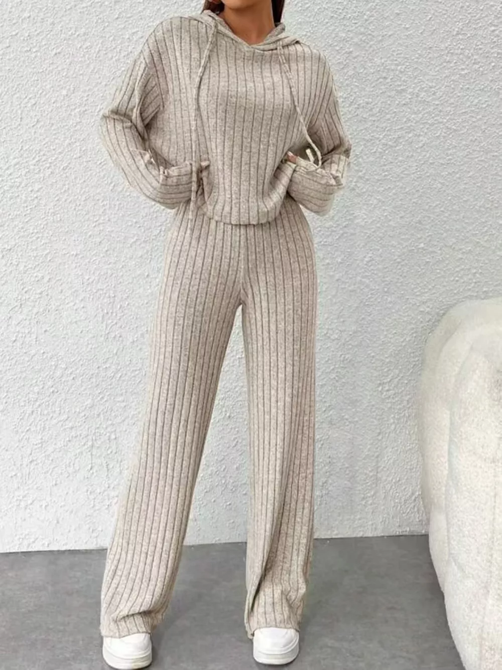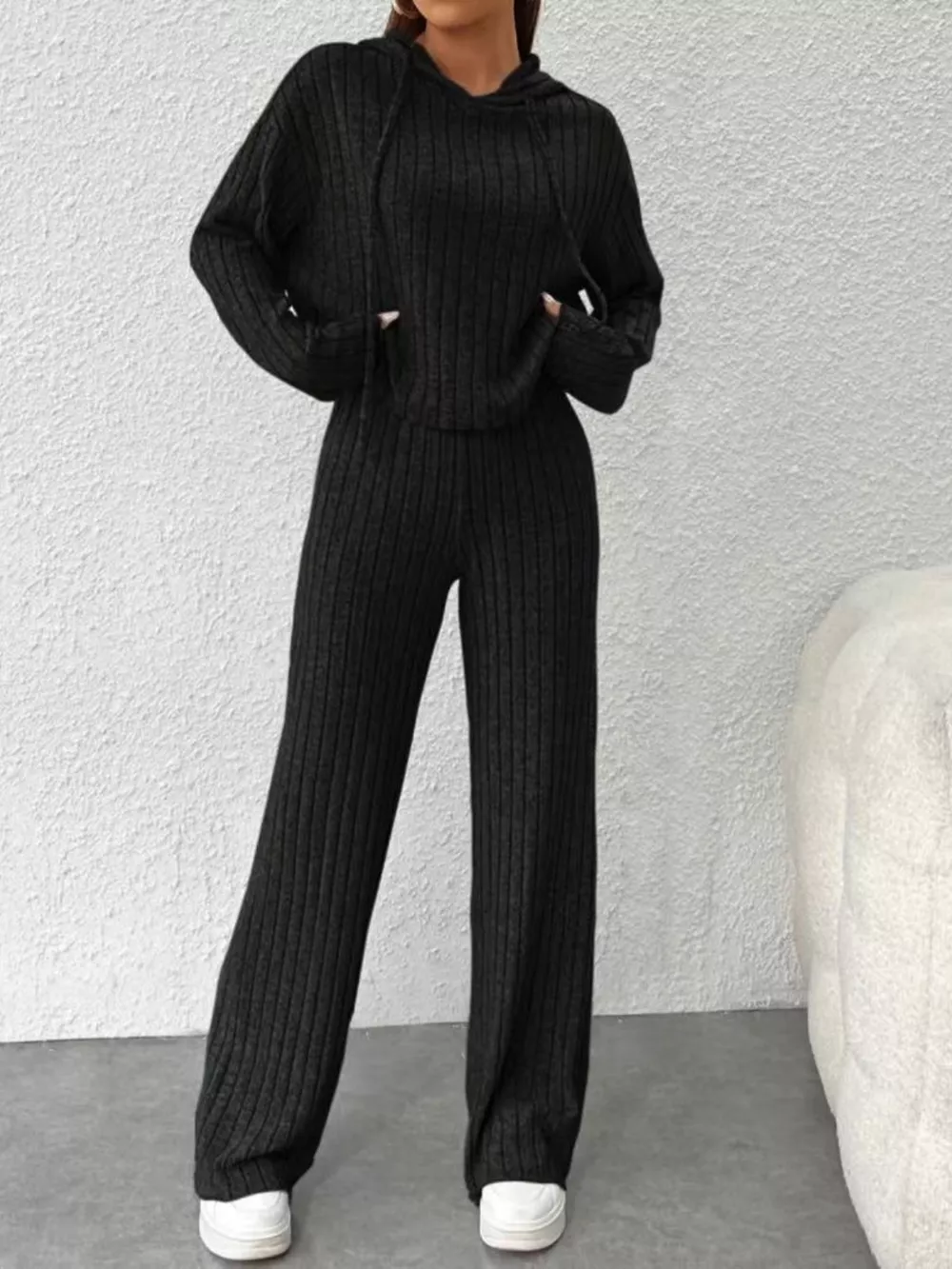 Ribbed Knit Hoodie & Wide Leg Pants Set