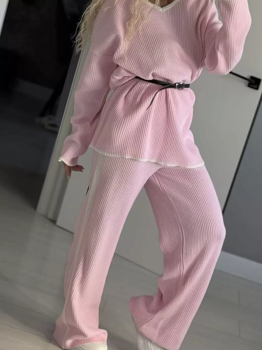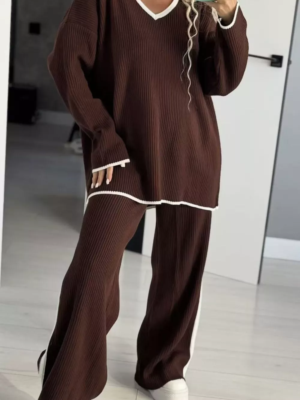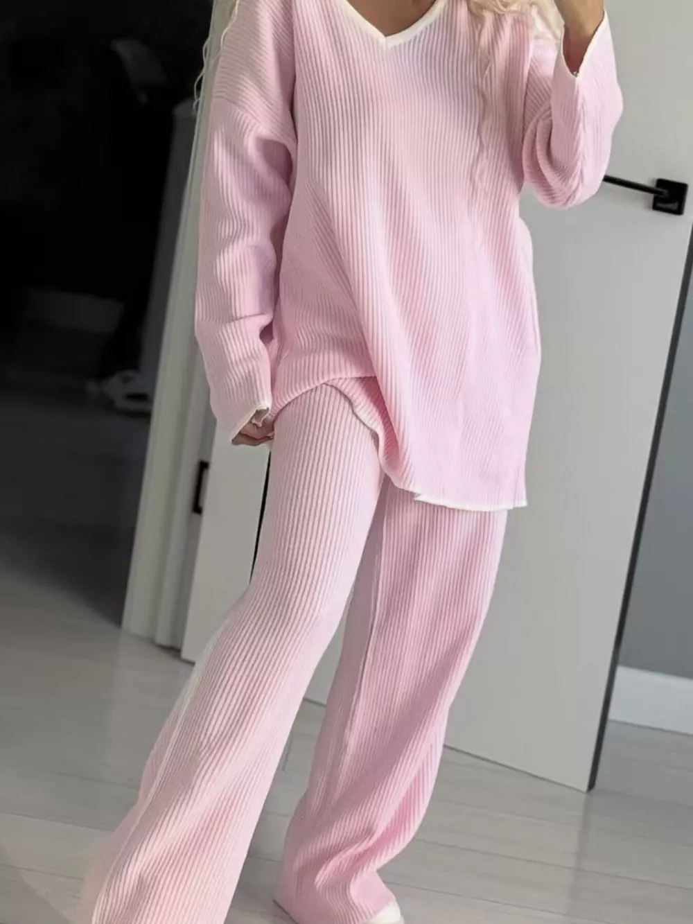 Contrast Trim V-Neck Top and Pants Knit Set