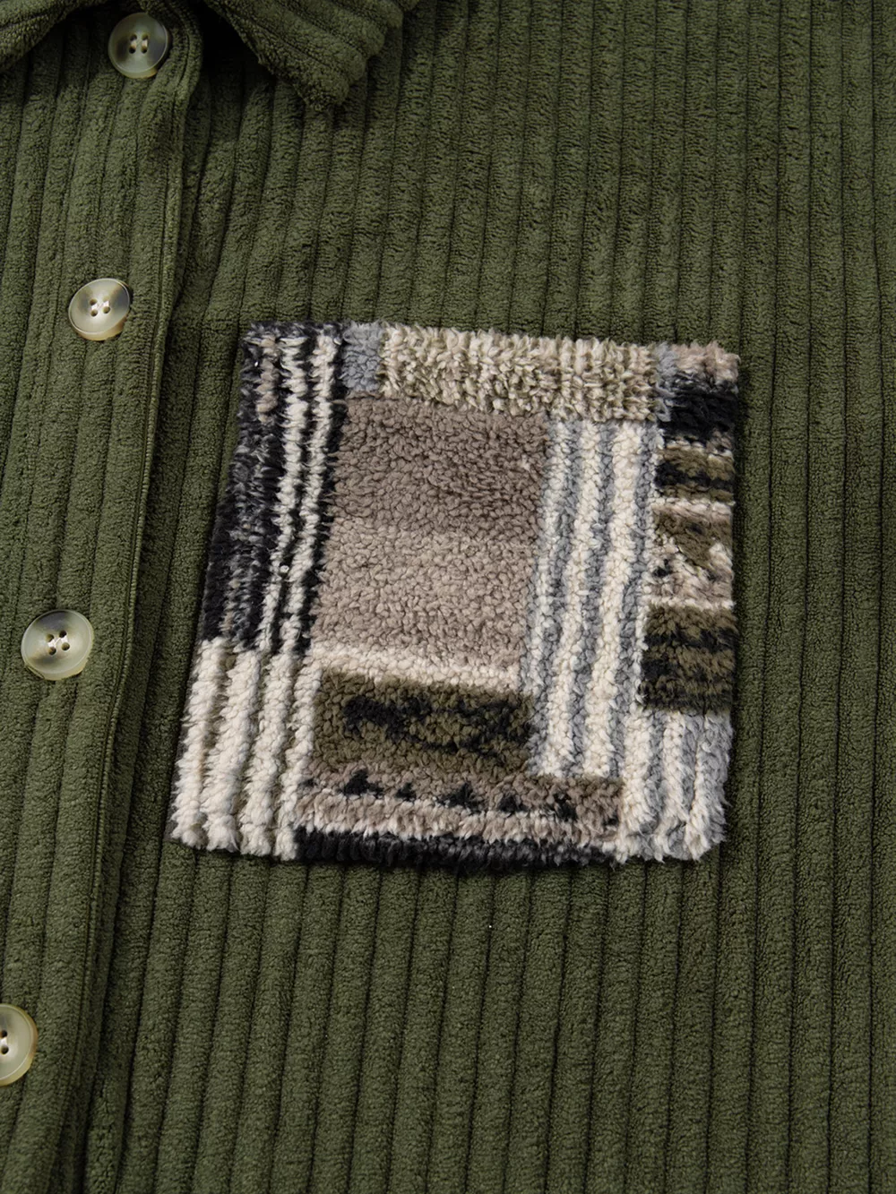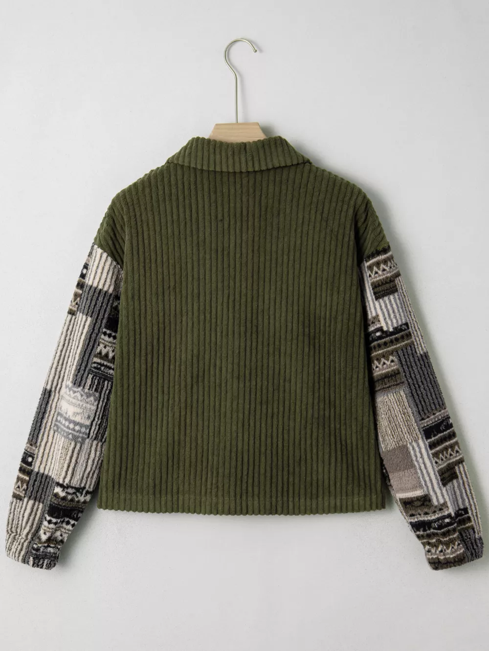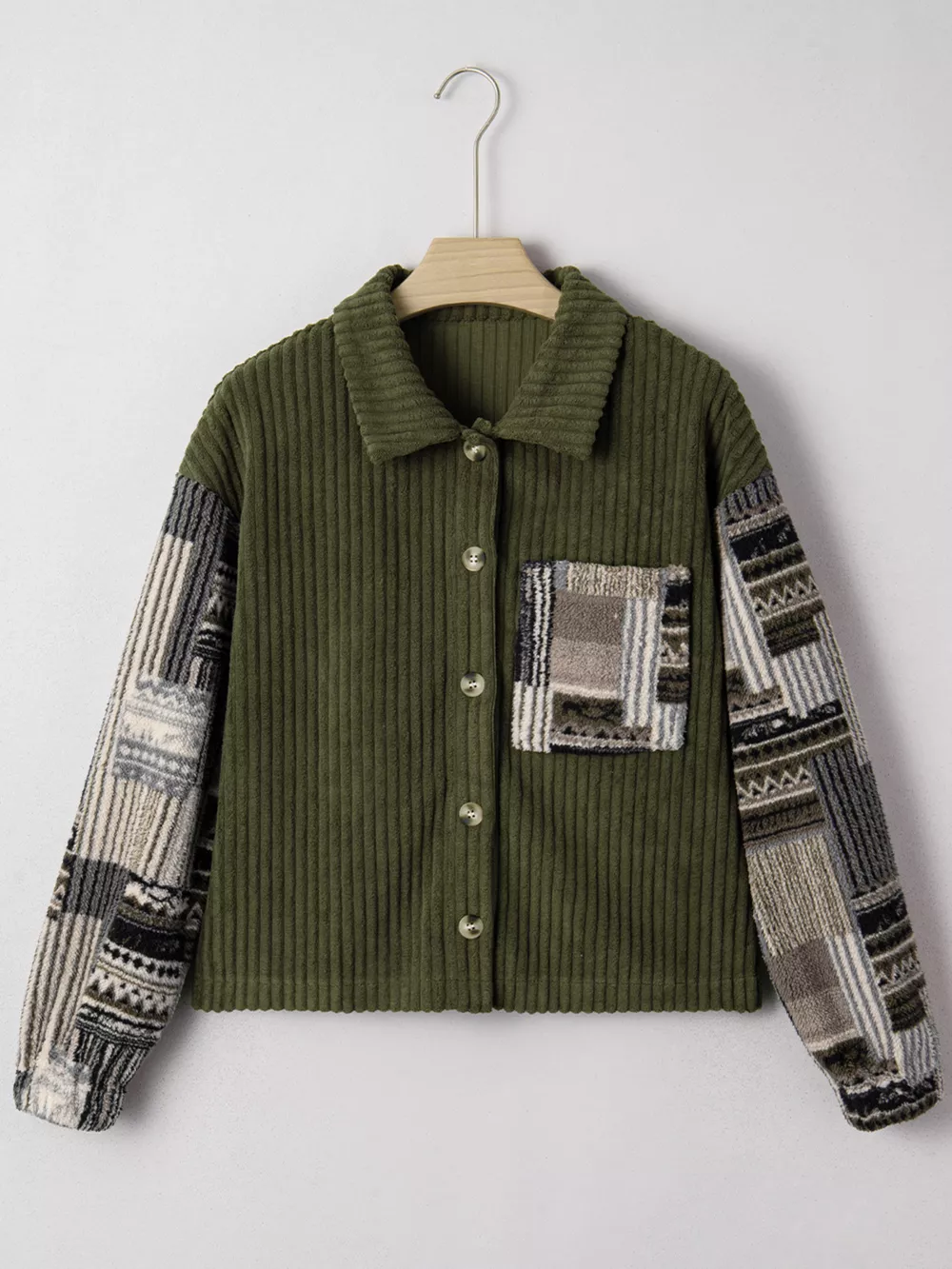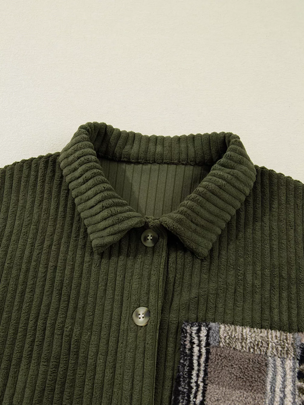 Ribbed Fleece Plaid Print Patchwork Button Up Jacket