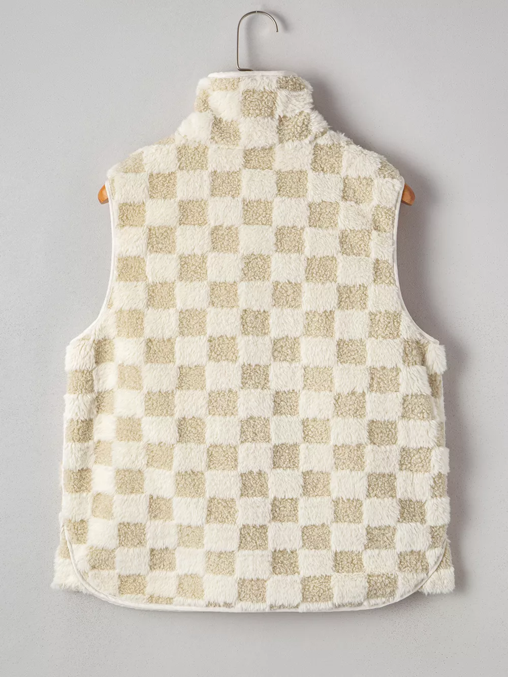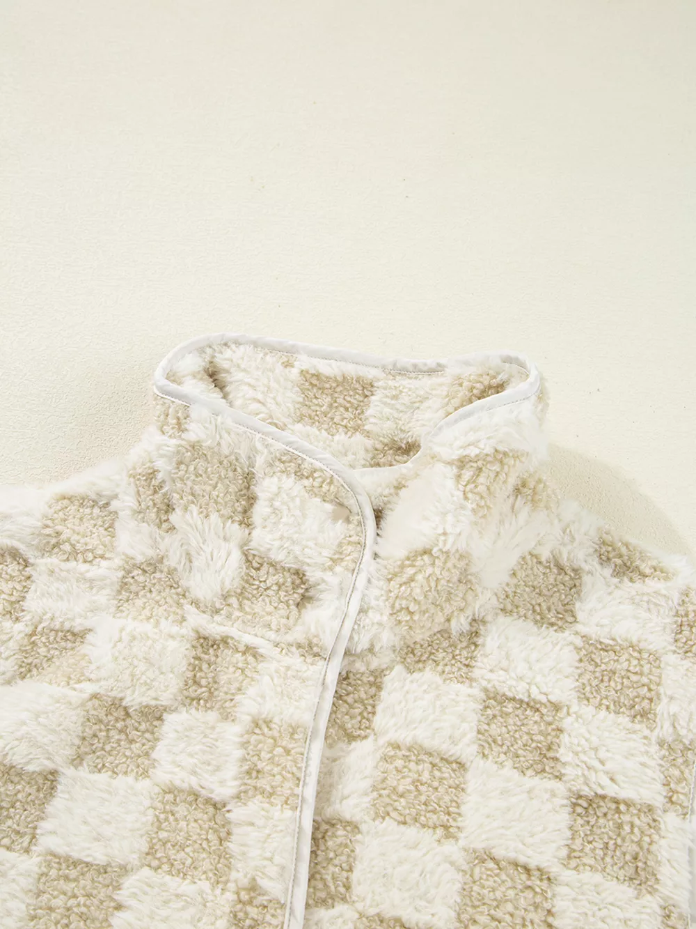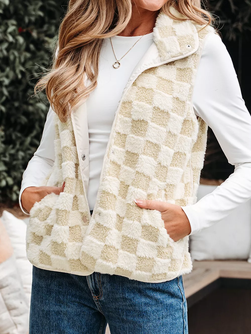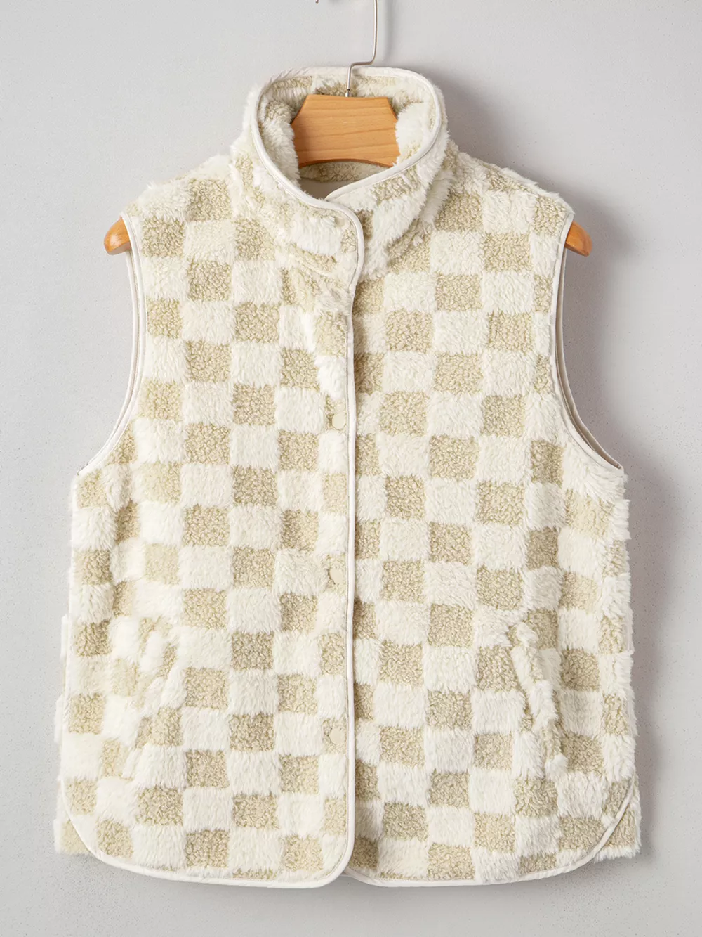 Sherpa Checkerboard Snap Button Vest Coat with Pocket
