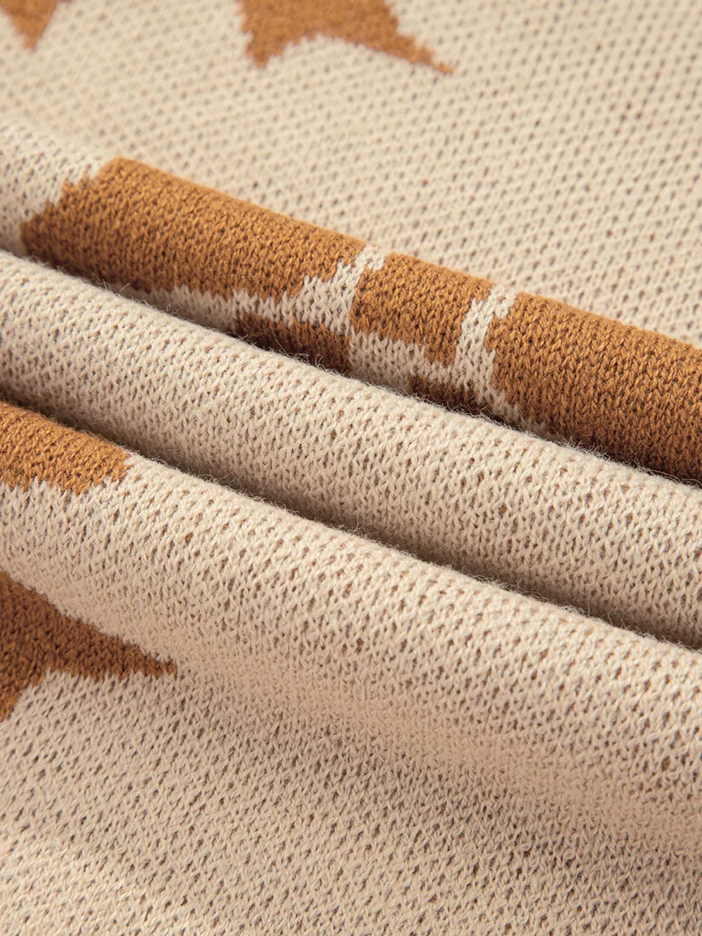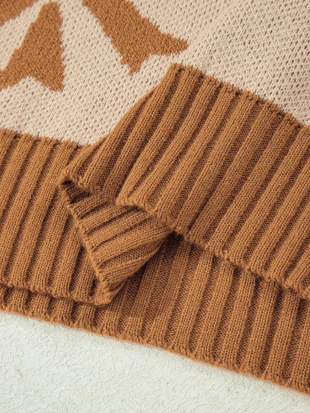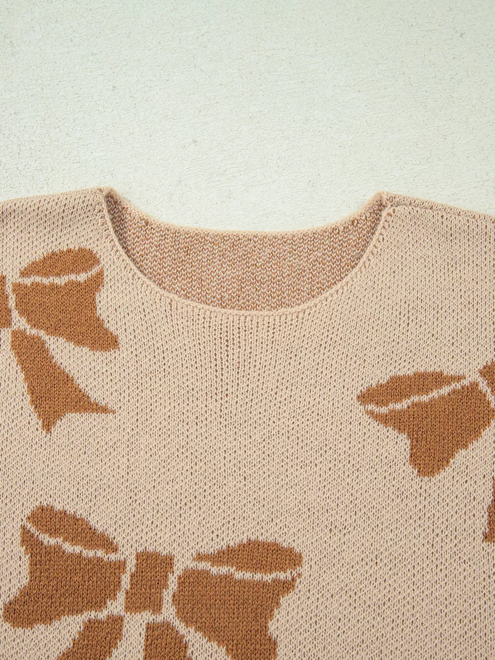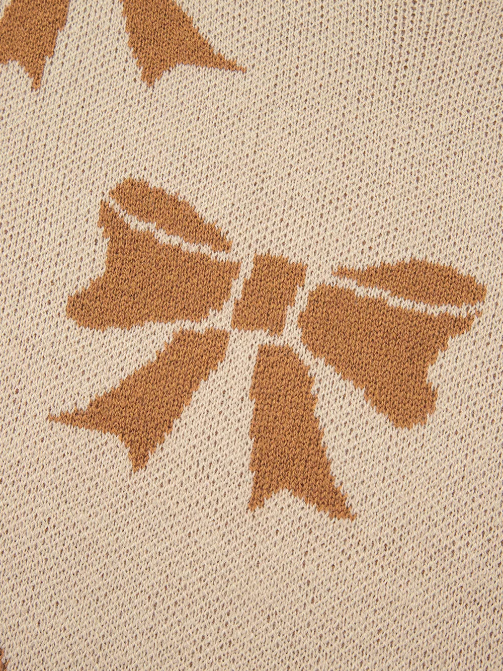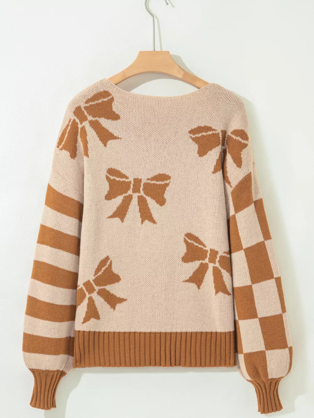 Ribbon Bow Checkered Striped Sleeve Drop Shoulder Sweater