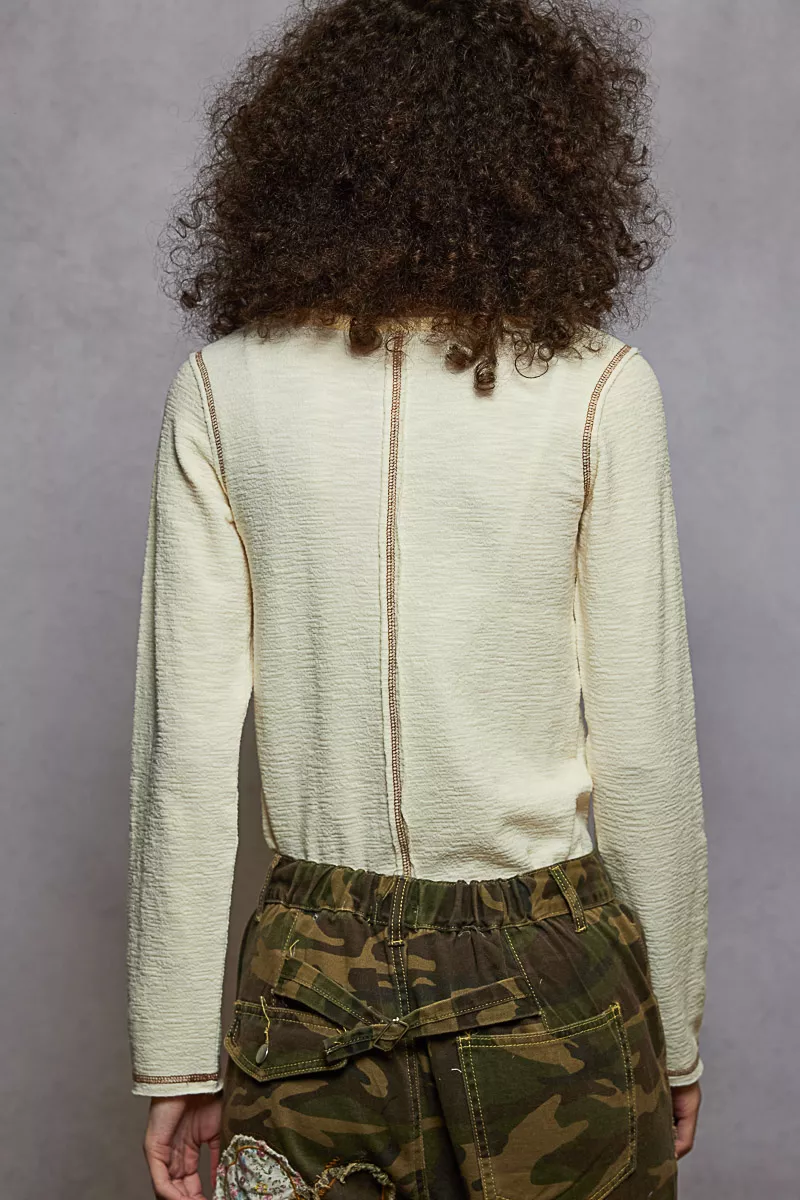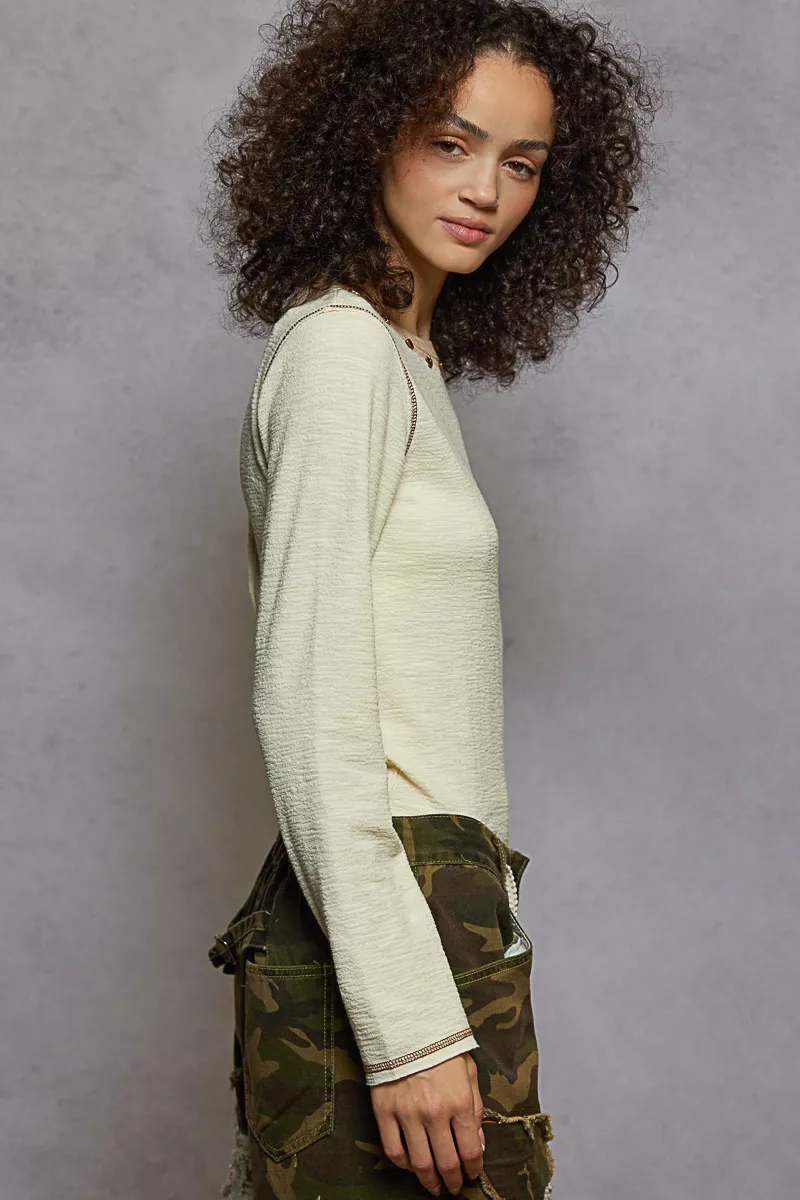 POL Round Neck Long Sleeve Contrast Stitching T-Shirt with Stud Detail