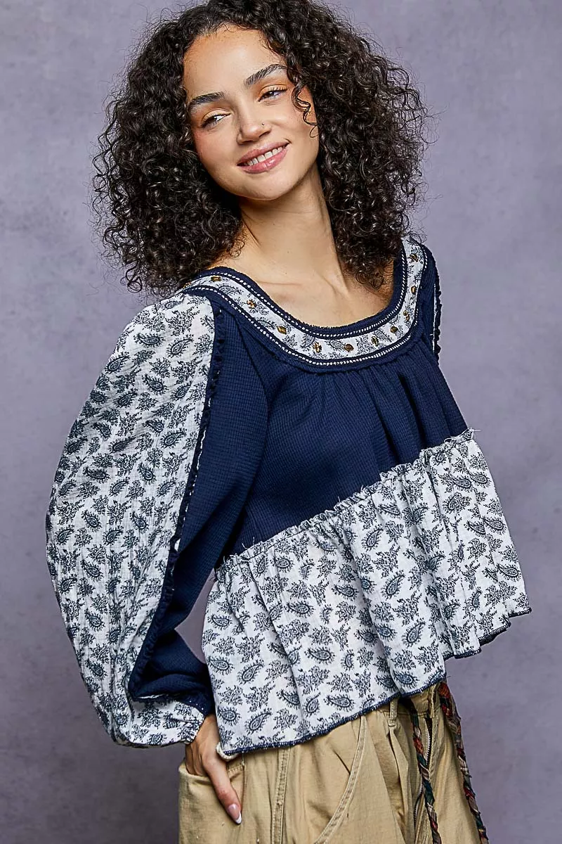 POL Paisley Scoop Neck Balloon Sleeve Cropped Blouse with Stud Detail