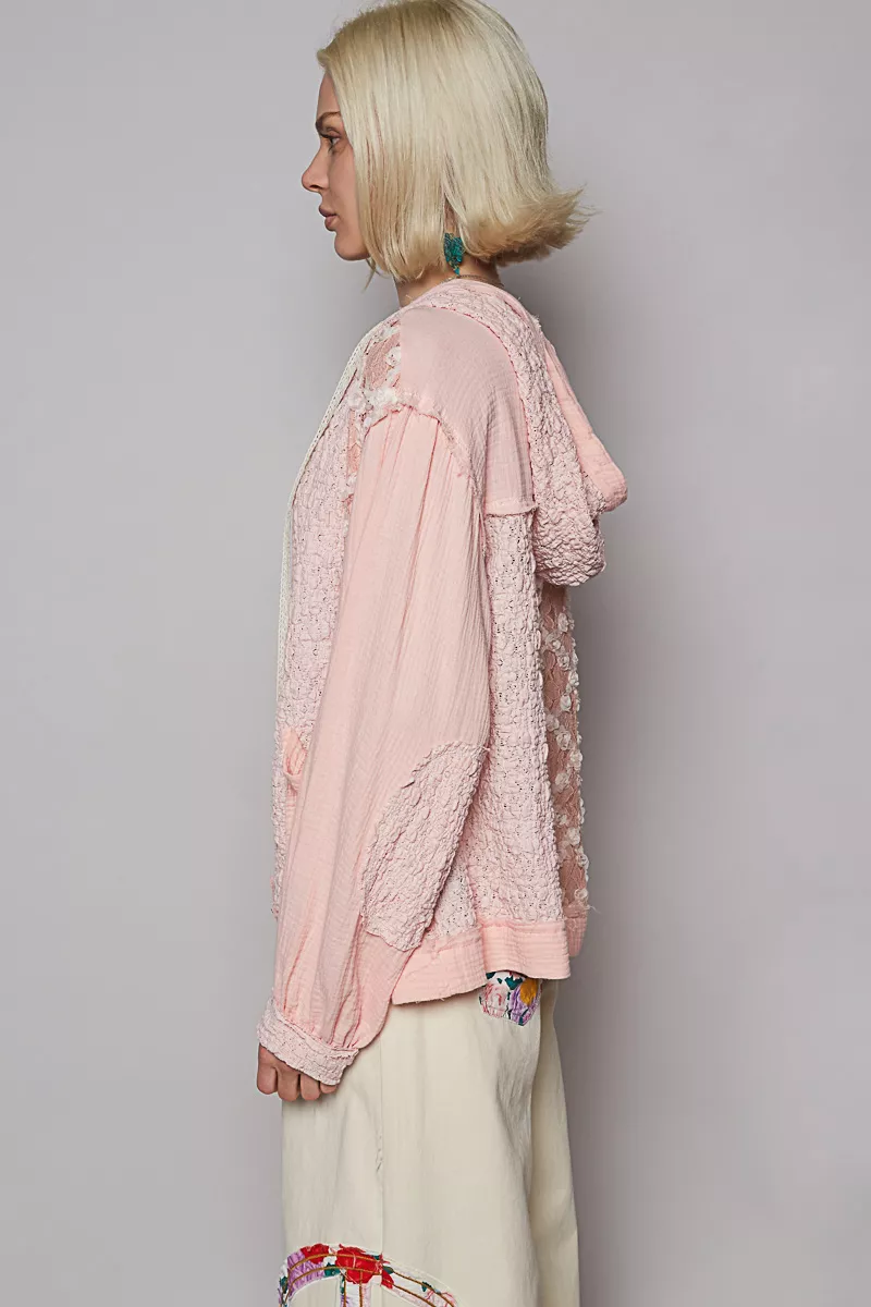POL Exposed Seam Button Down Hooded Jacket with Lace Detail
