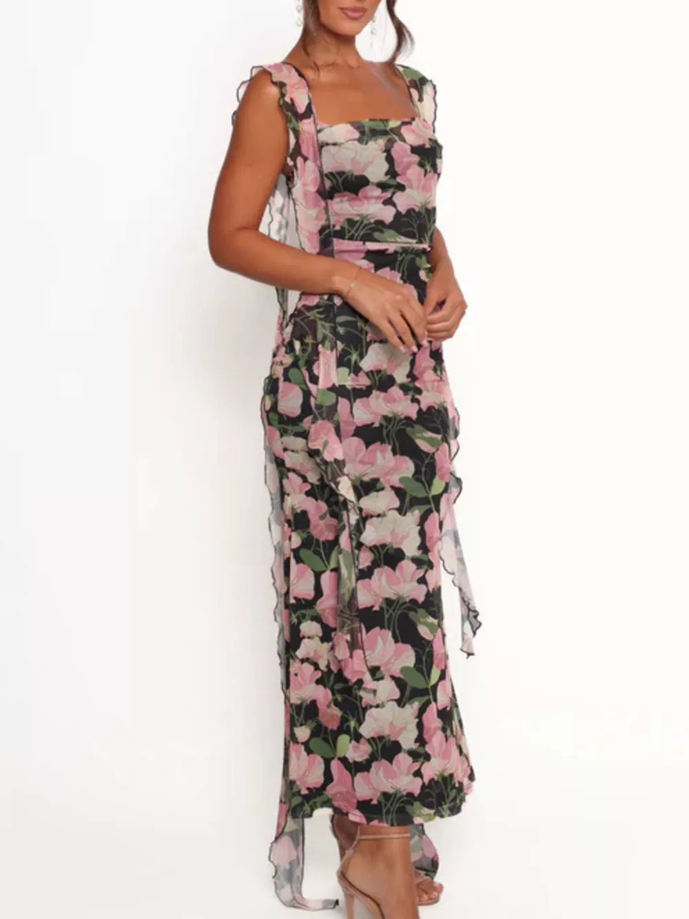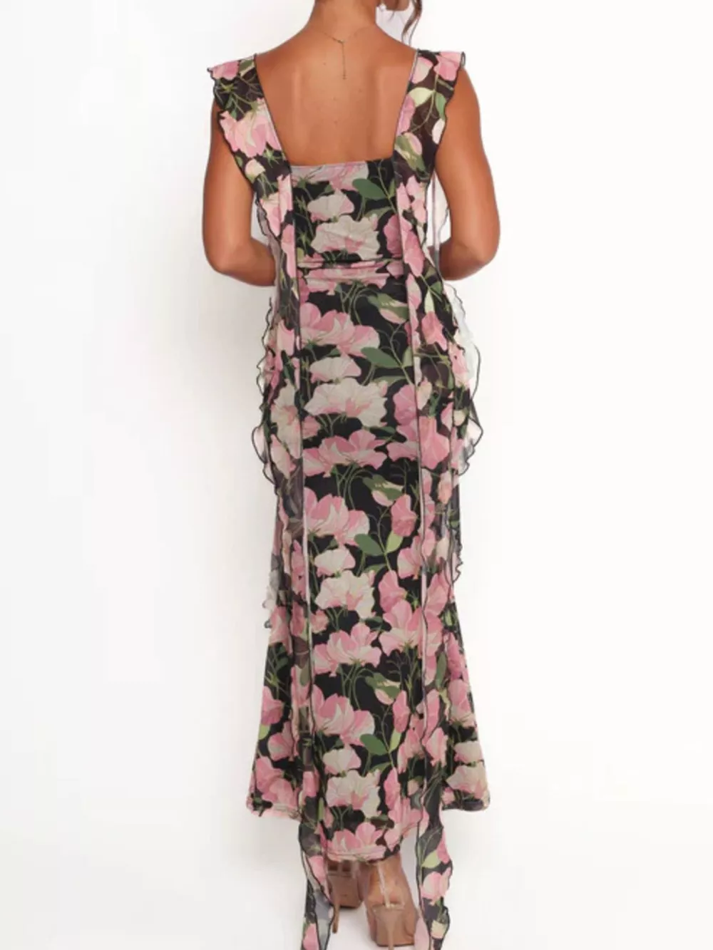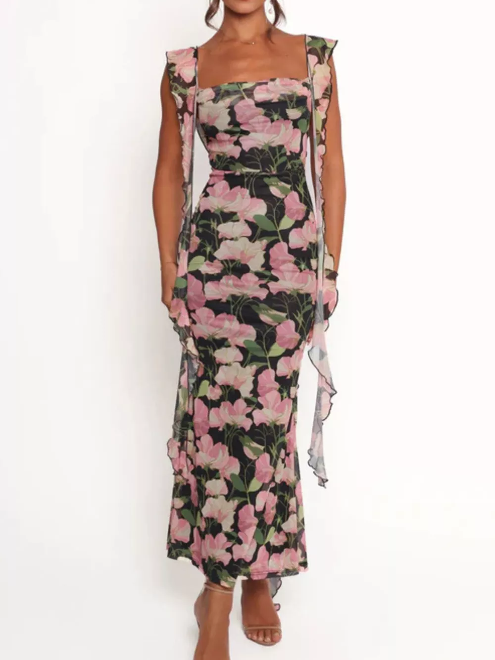 Floral Print Ruffle Trim Bodycon Maxi Dress