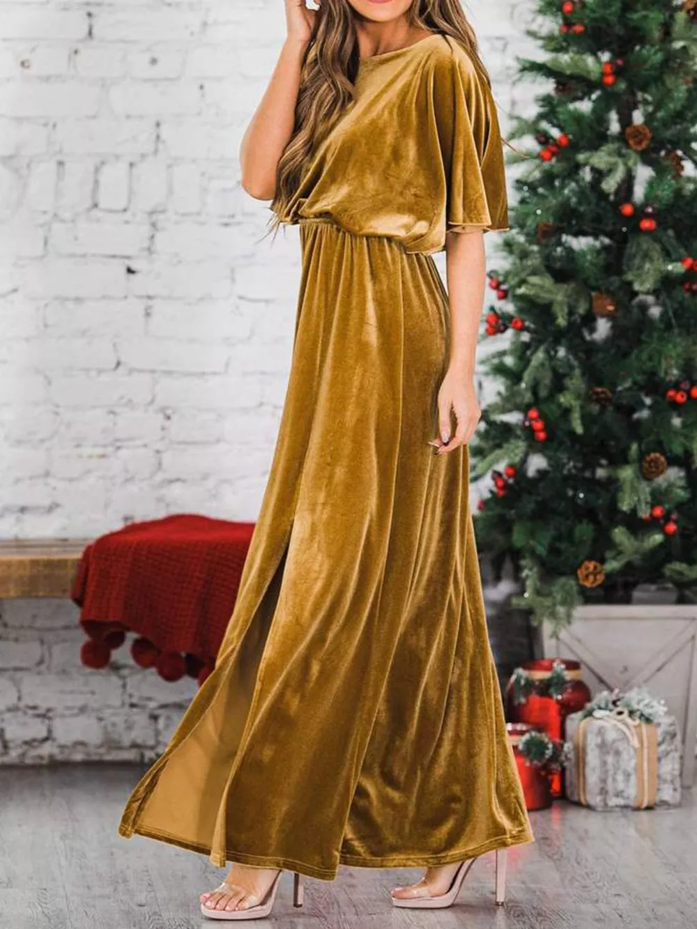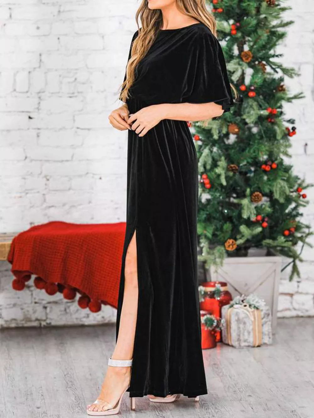 Slit Round Neck Flutter Sleeve Velvet Maxi Dress