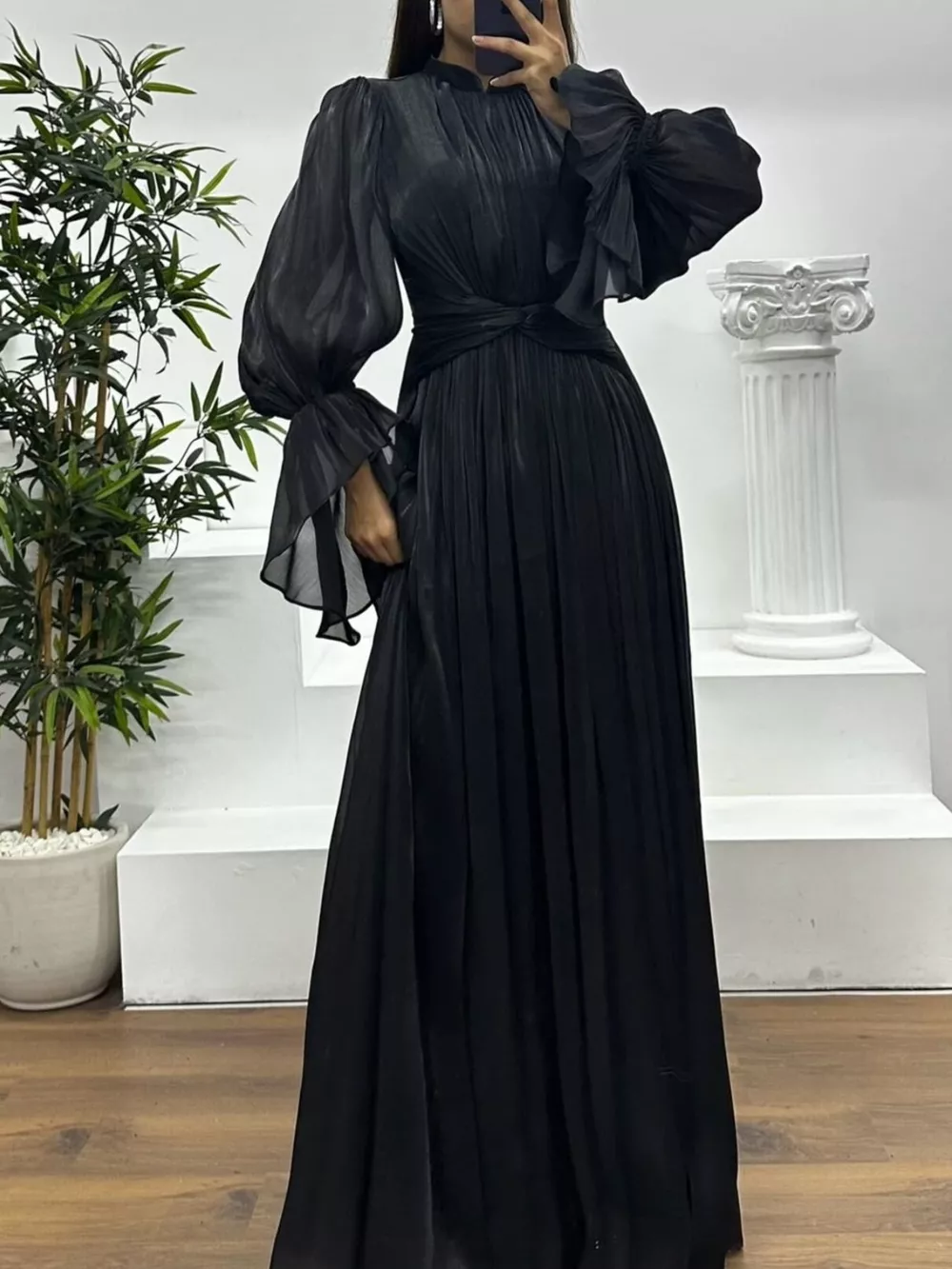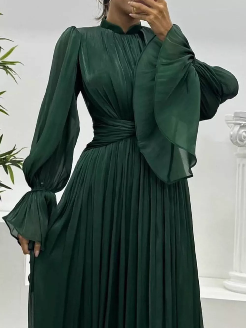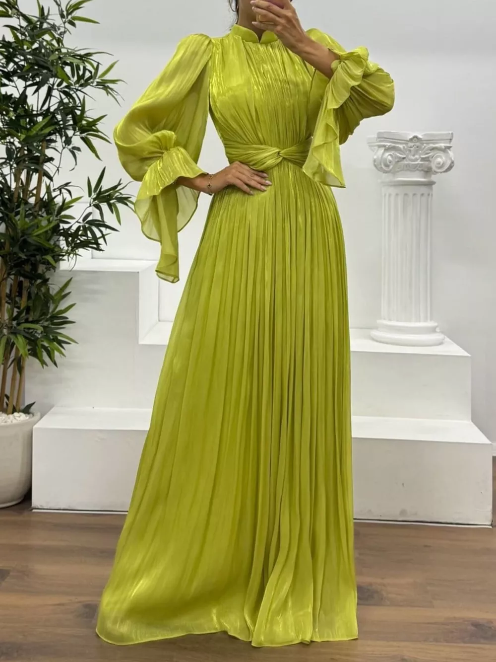 Pleated Mock Neck Long Sleeve Maxi Dress