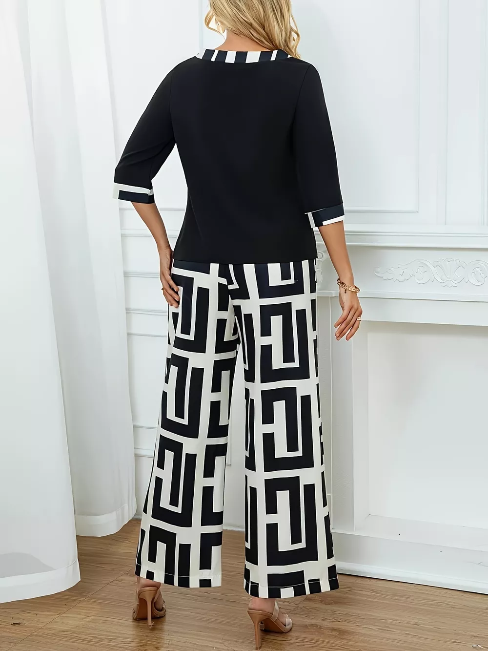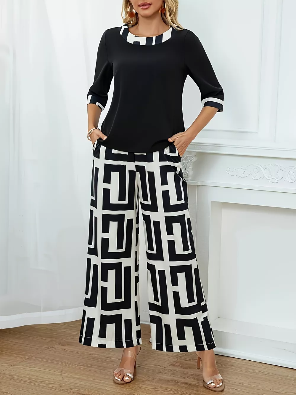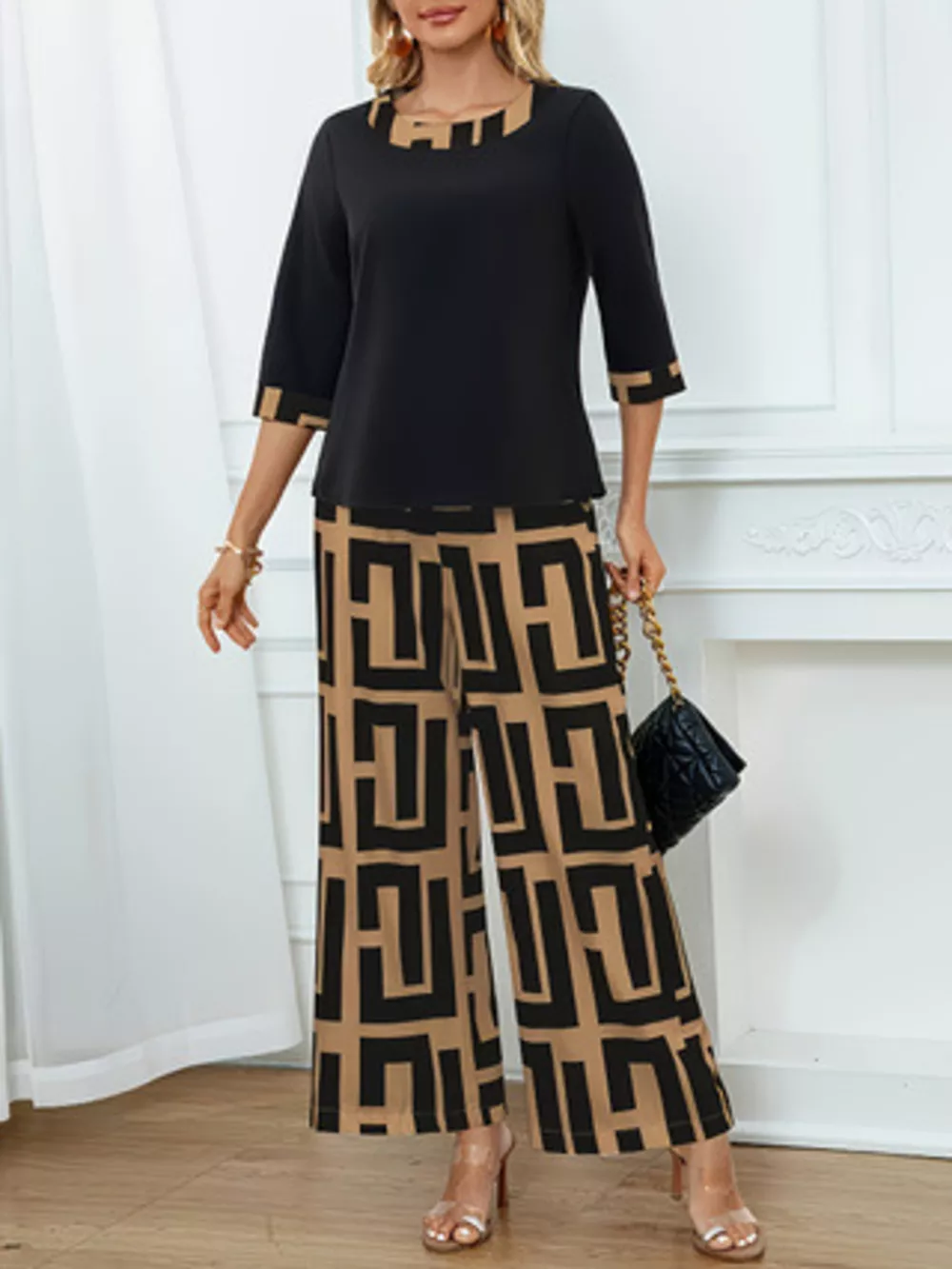 Geometric Print Round Neck Top and Pants Two-Piece Set