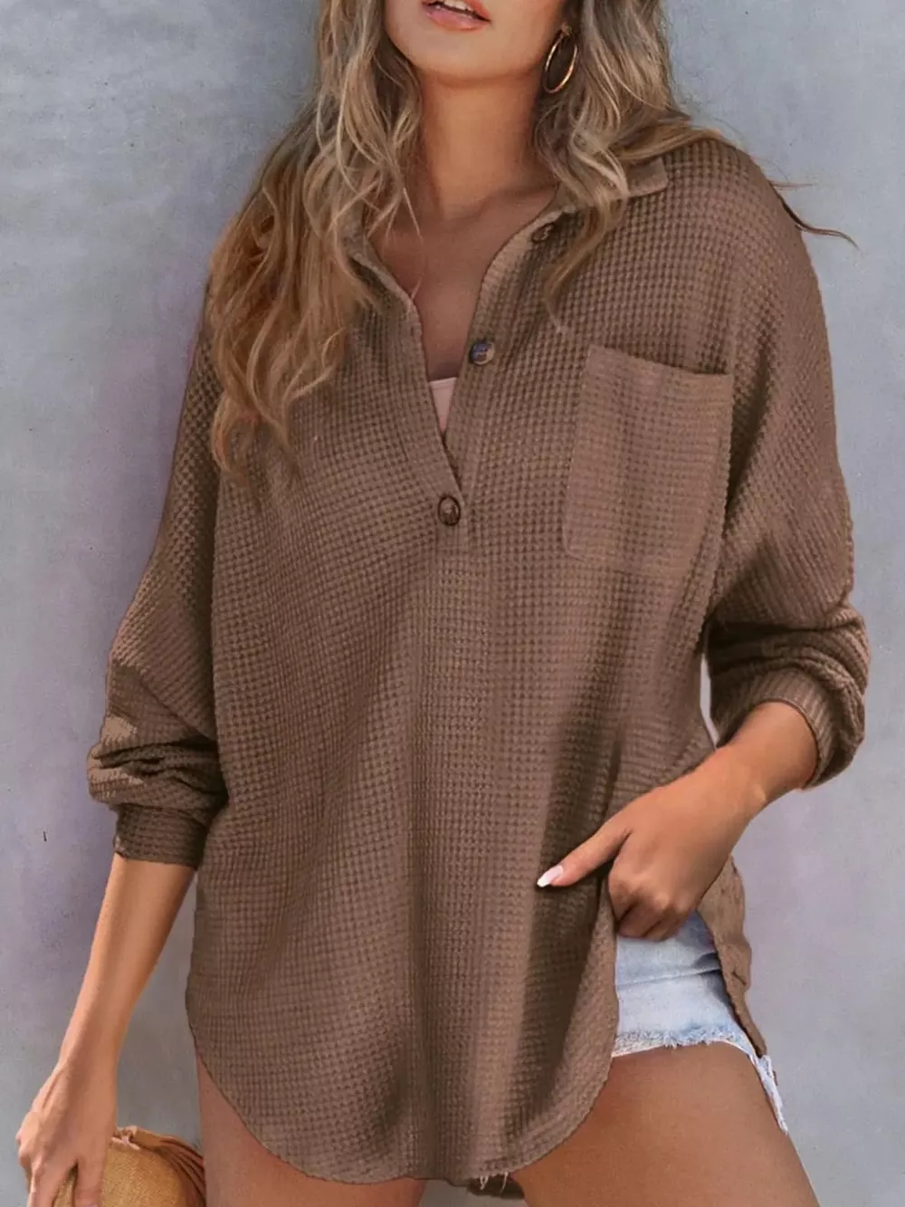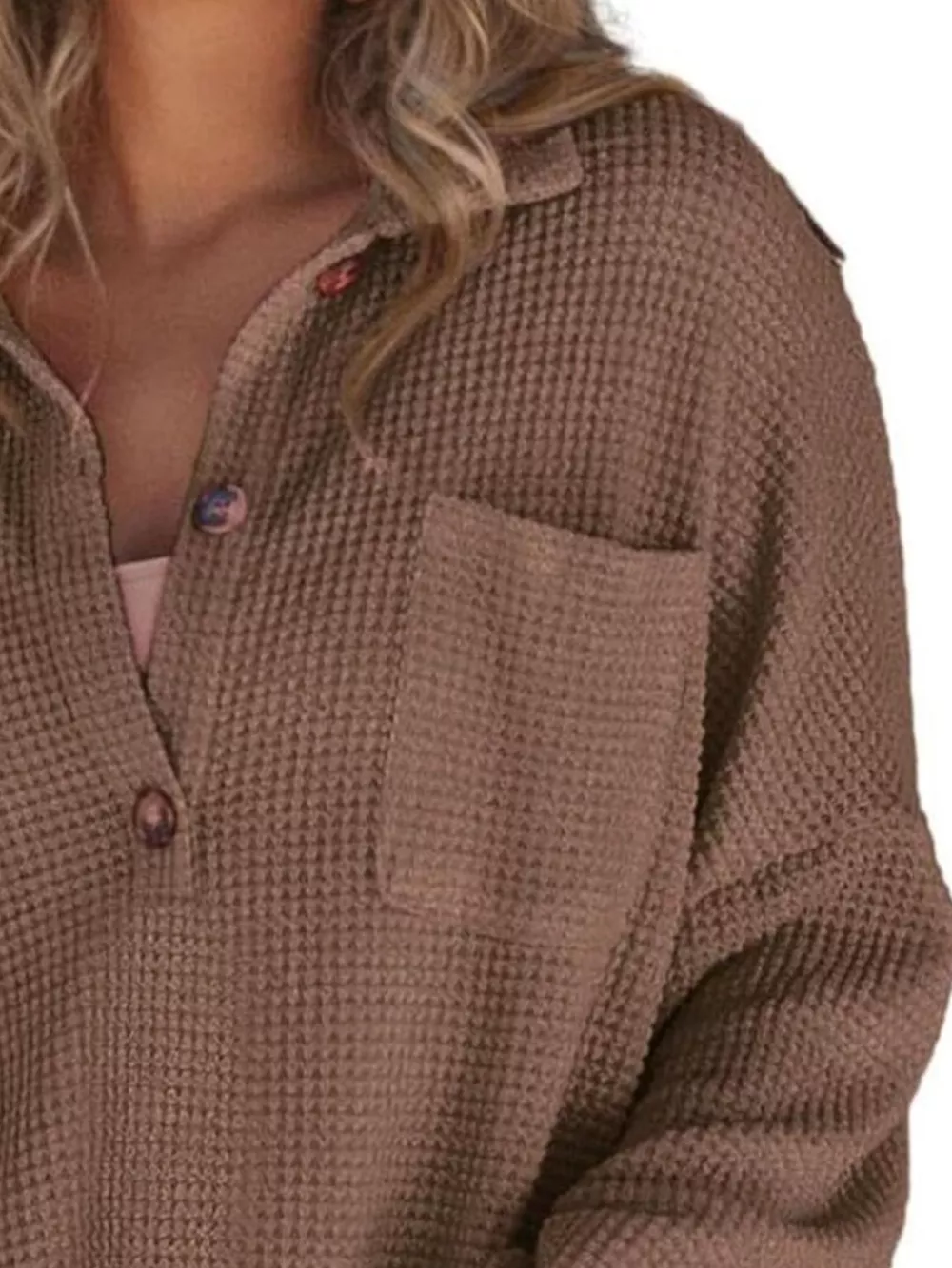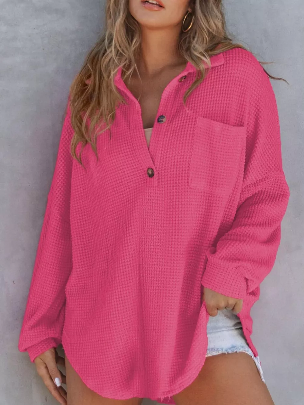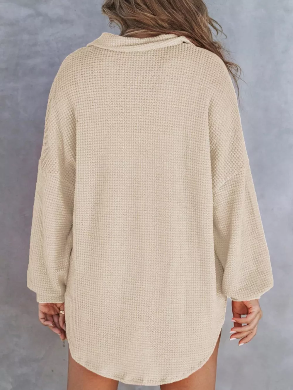 - Features:Waffle-Knit,Buttoned,Pocketed,Oversized