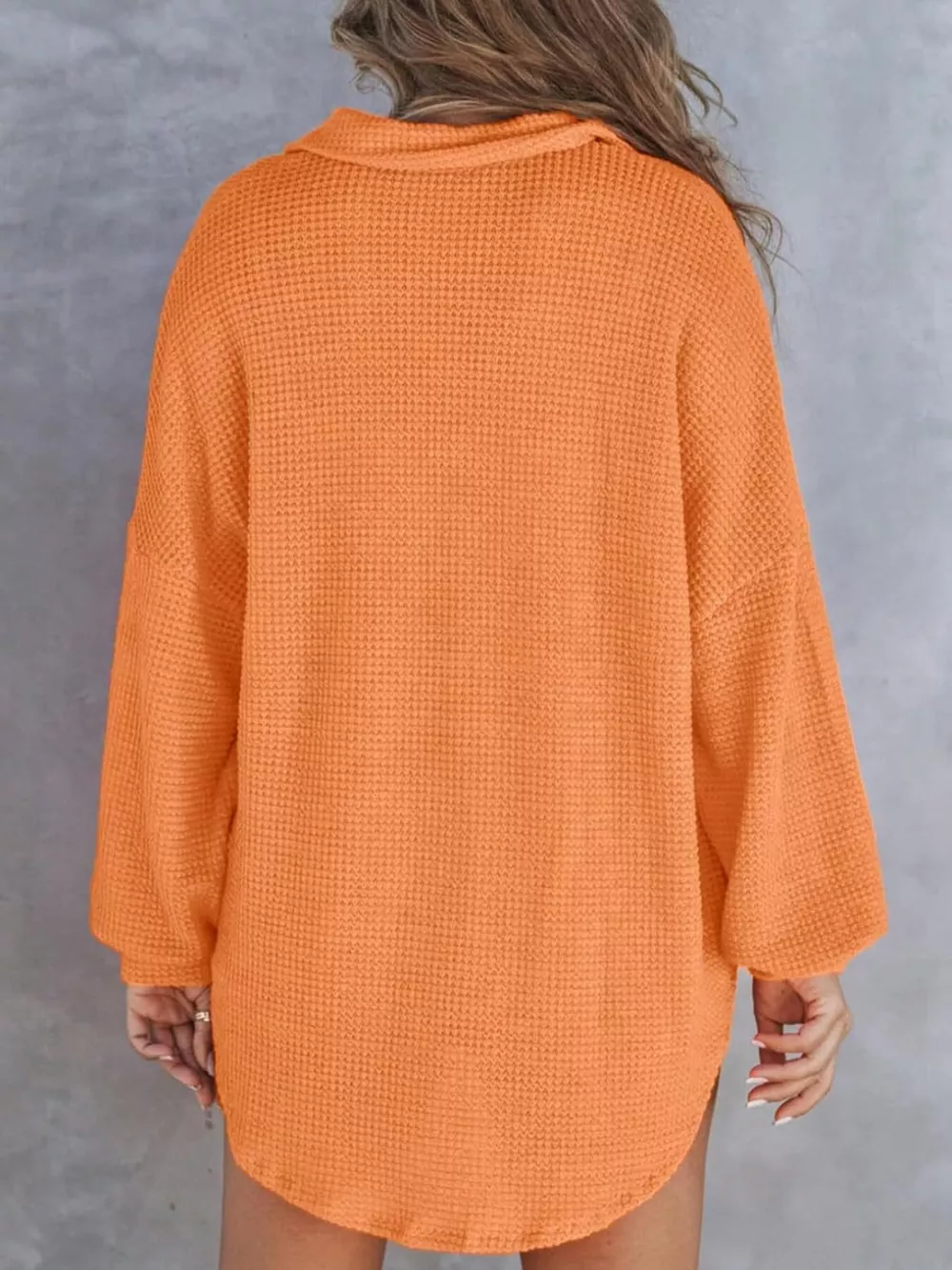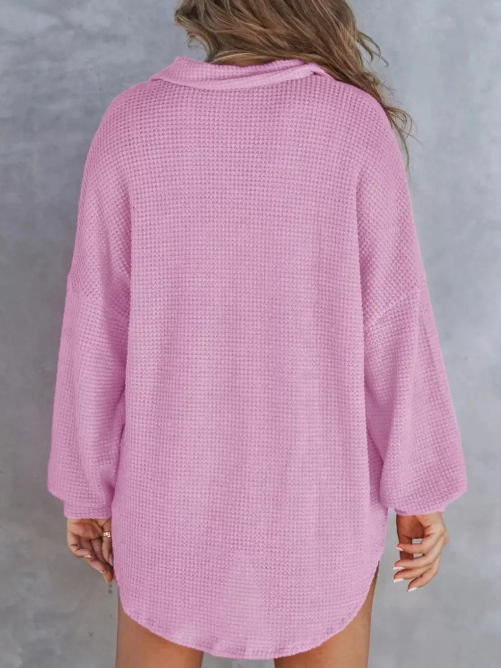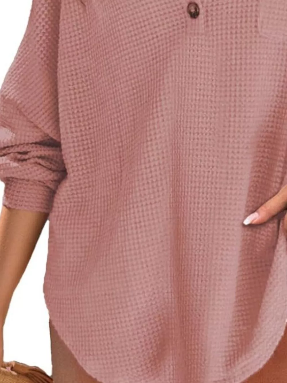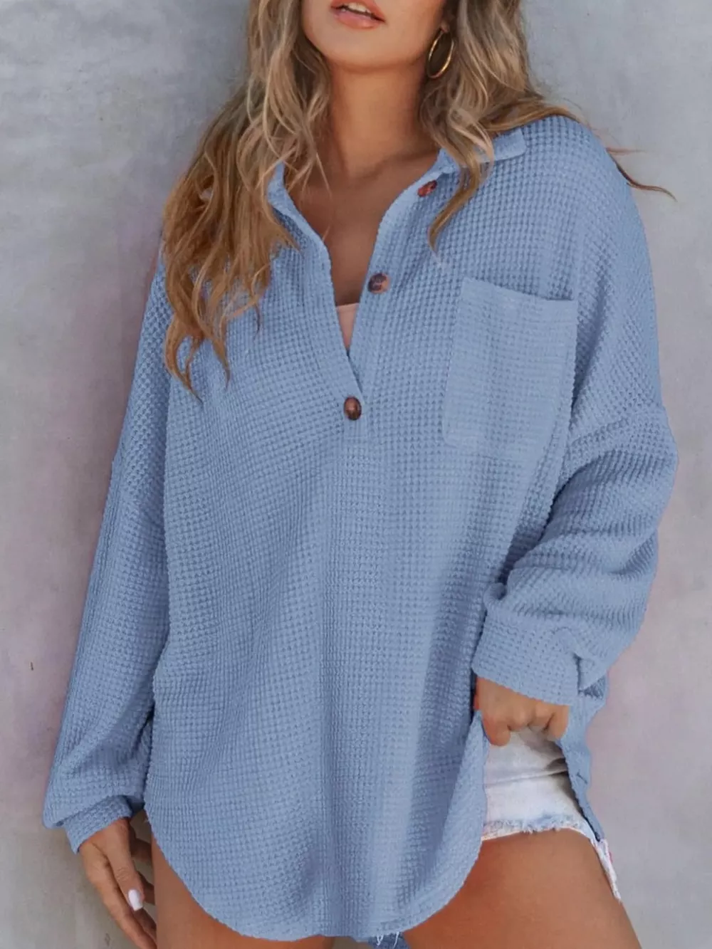 - Features:Waffle-Knit,Buttoned,Pocketed,Oversized