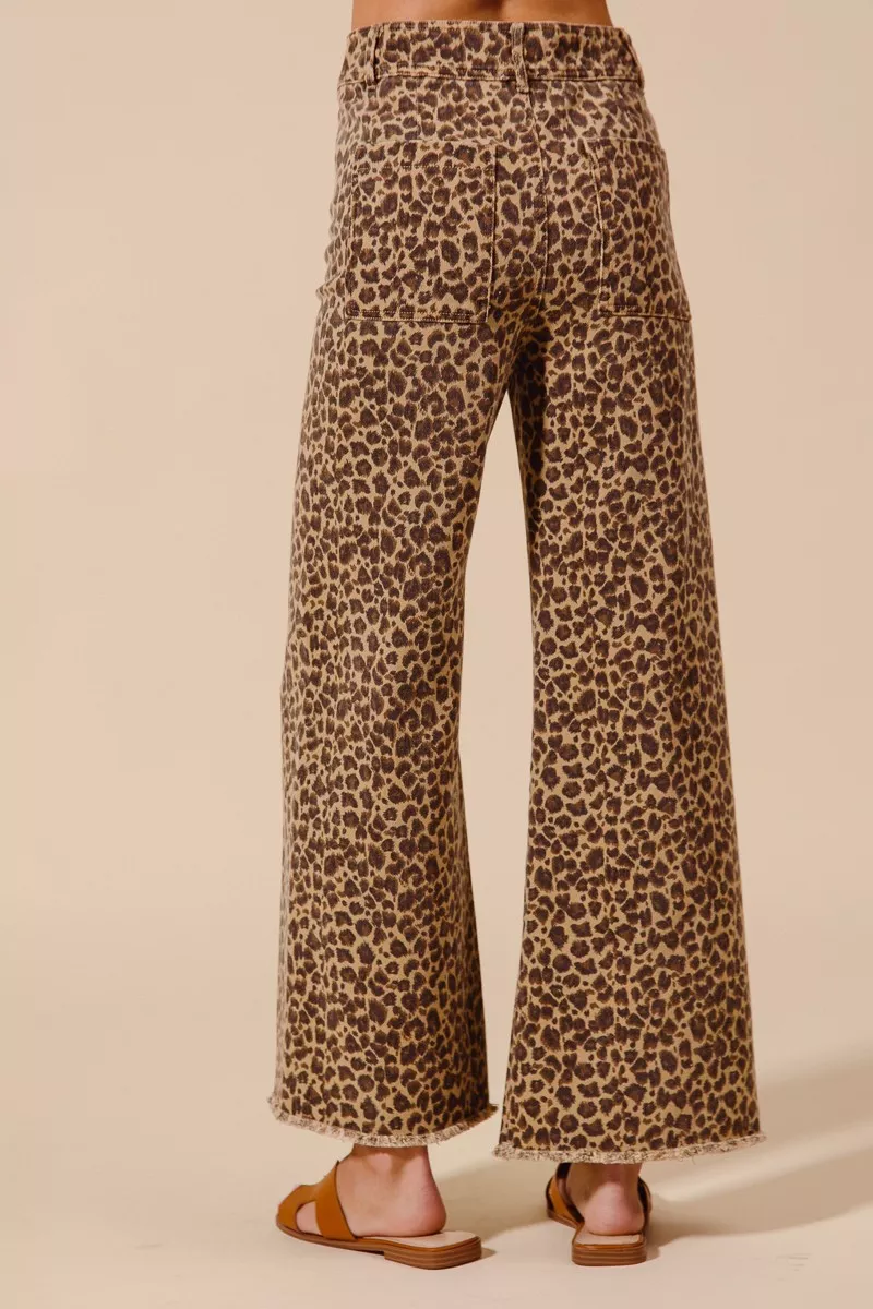 SO ME Mid Rise Leopard Twill Frayed Hem Wide Leg Pants