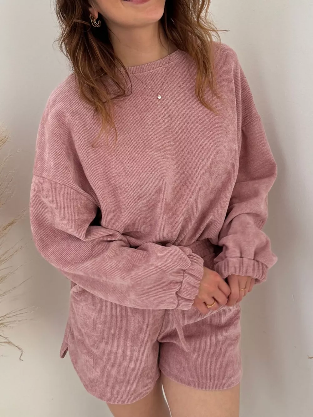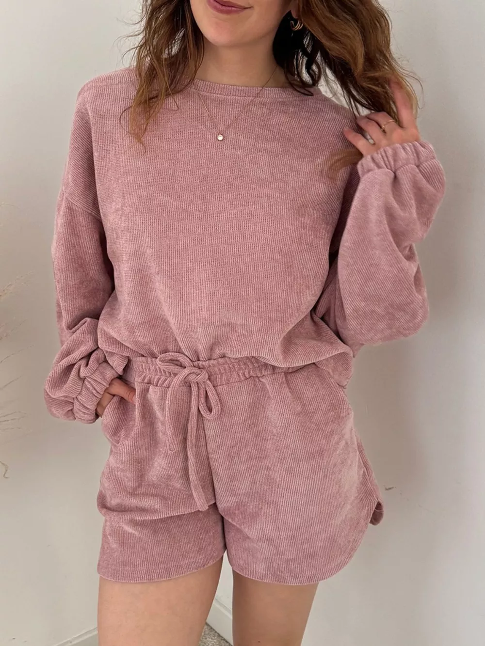 Round Neck Dropped Shoulder Top and Drawstring Shorts Set