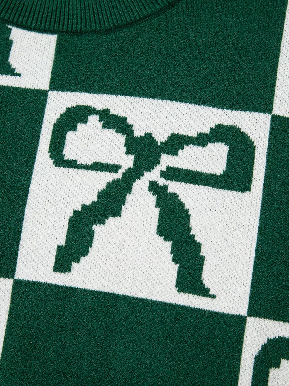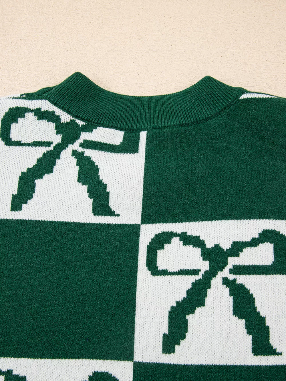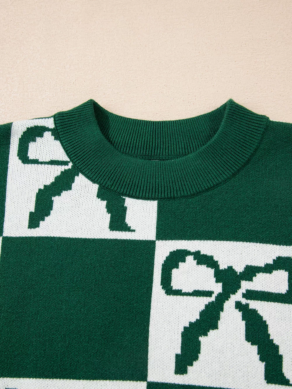 Checkered Bow Round Neck Casual Sweater