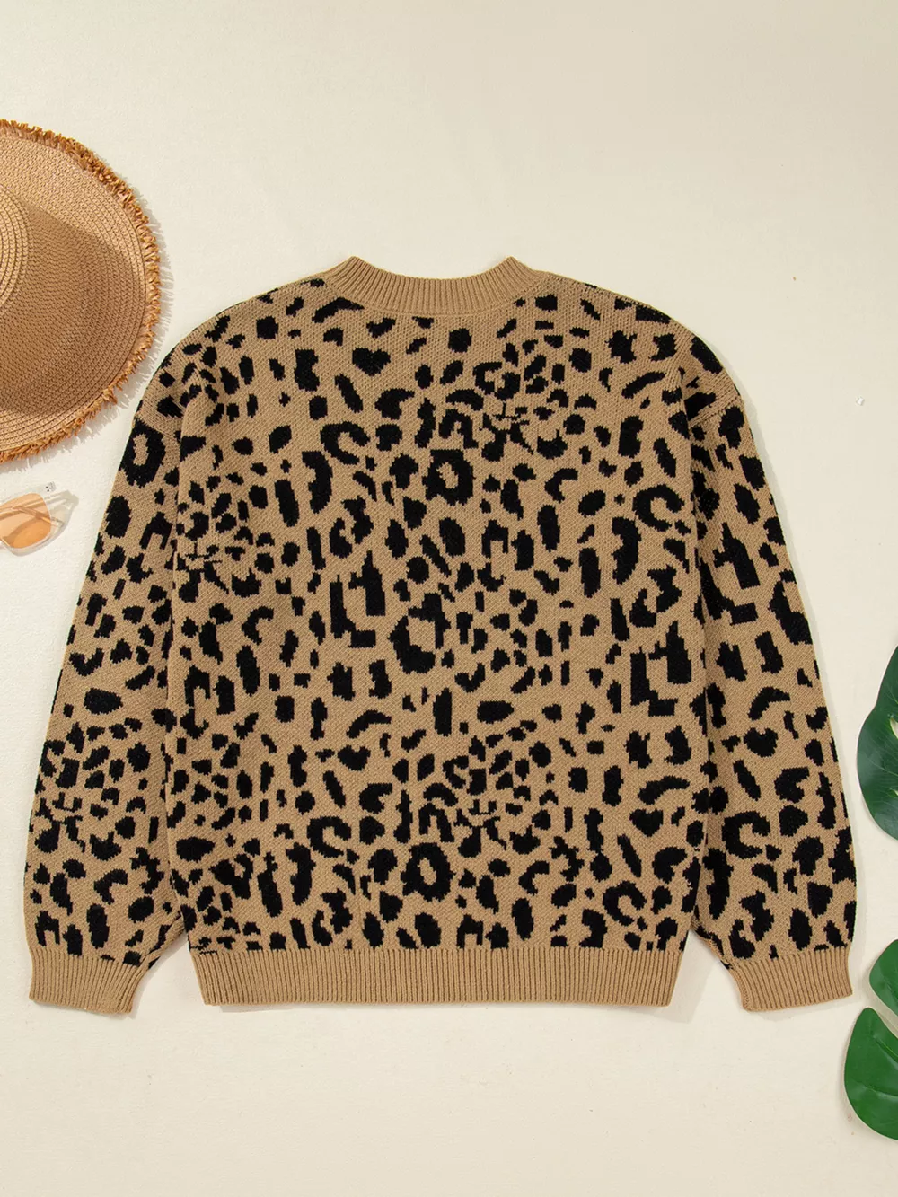 Ribbed Trim Round Neck Leopard Drop Shoulder Sweater