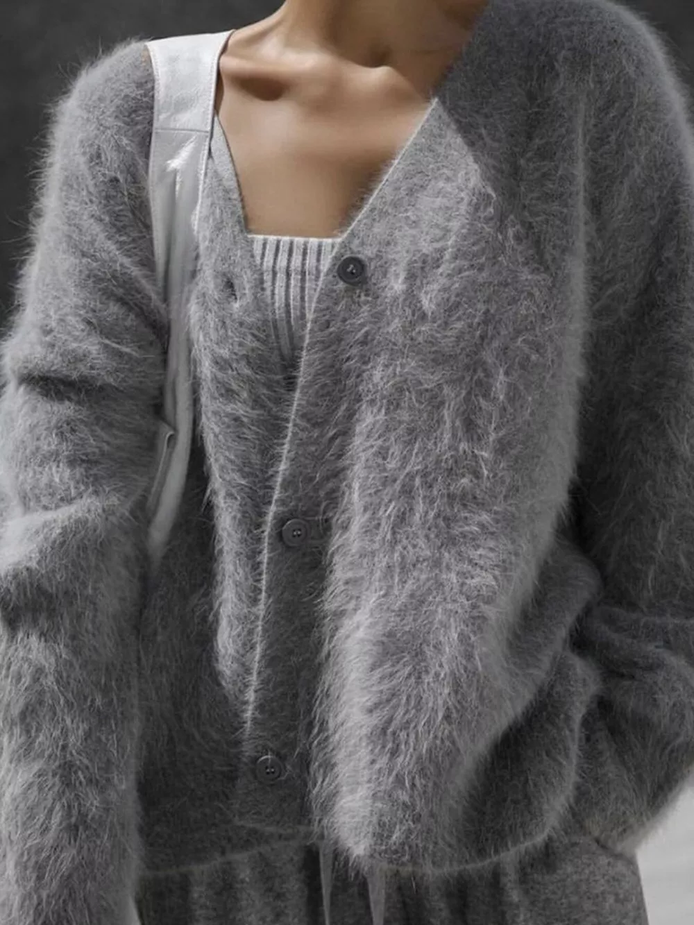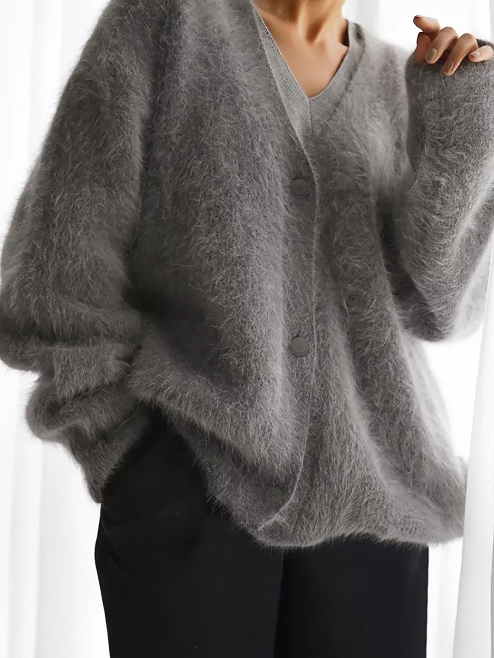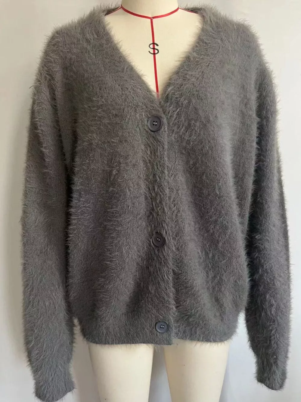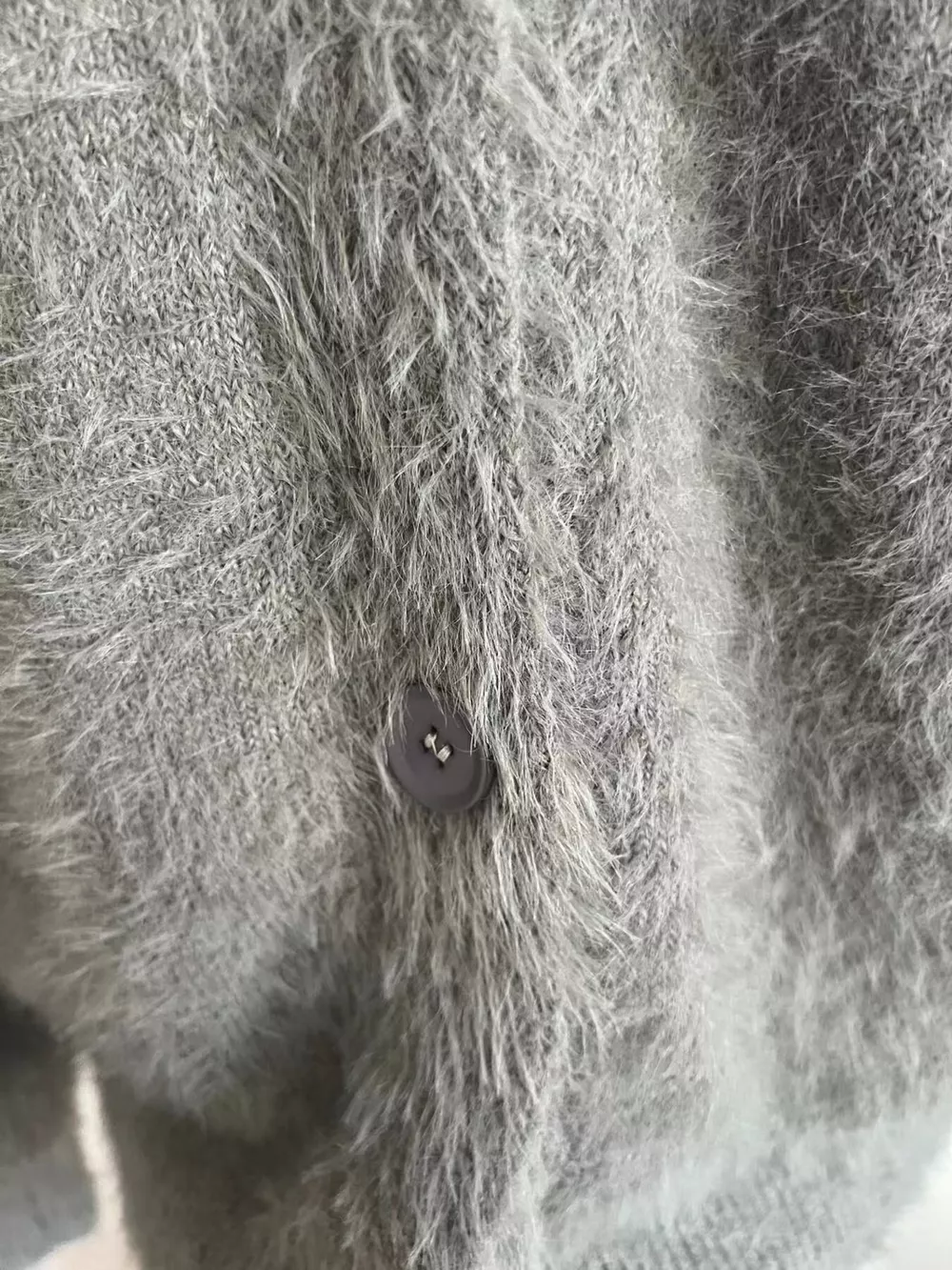 V Neck Button Down Fuzzy Knit Mohair Cardigan