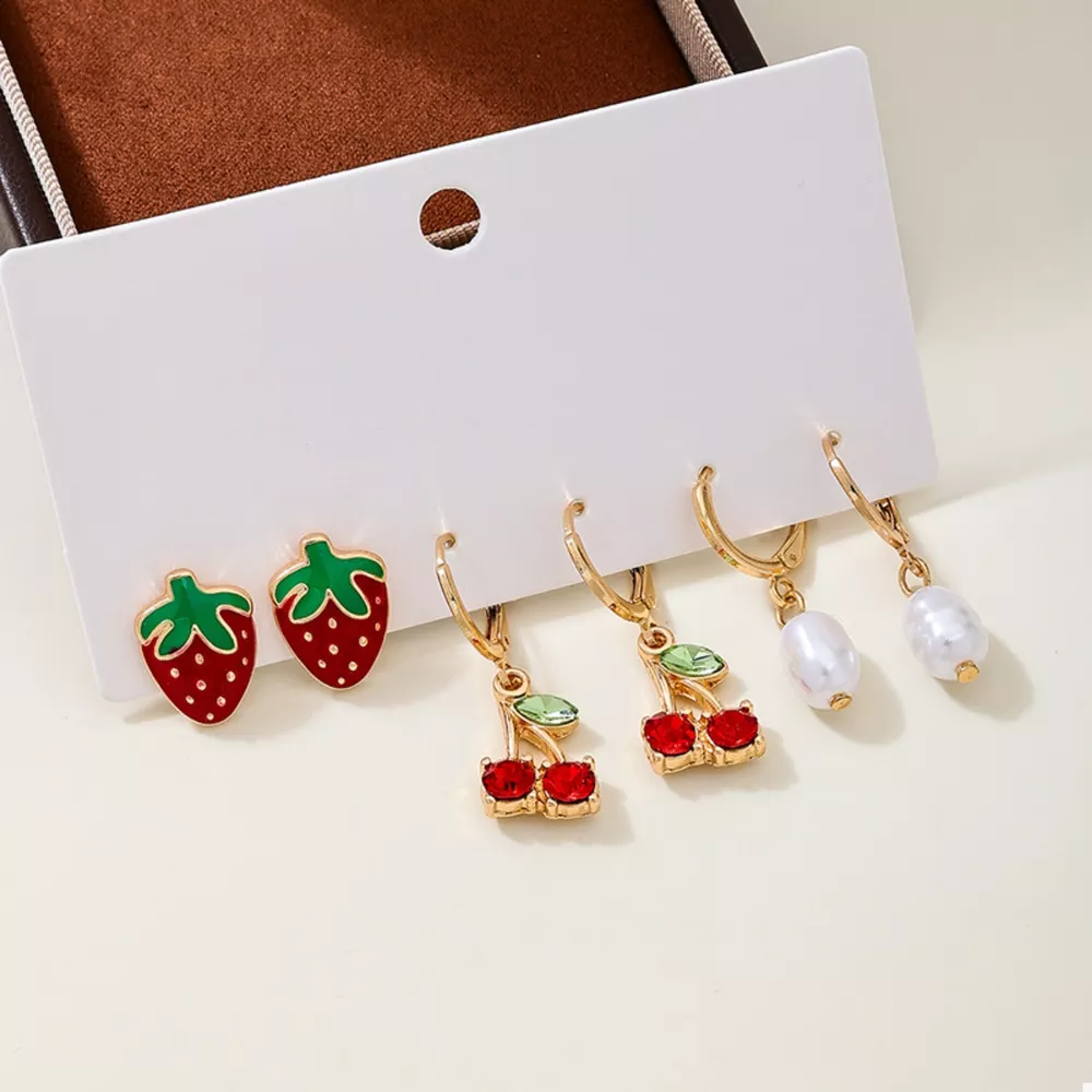3 Piece 18K Gold-Plated Strawberry Cherry and Pearl Earrings