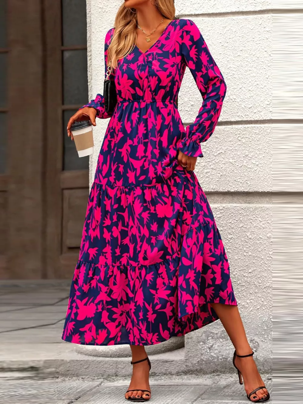 Printed V-Neck Flounce Sleeve Tiered Midi Dress