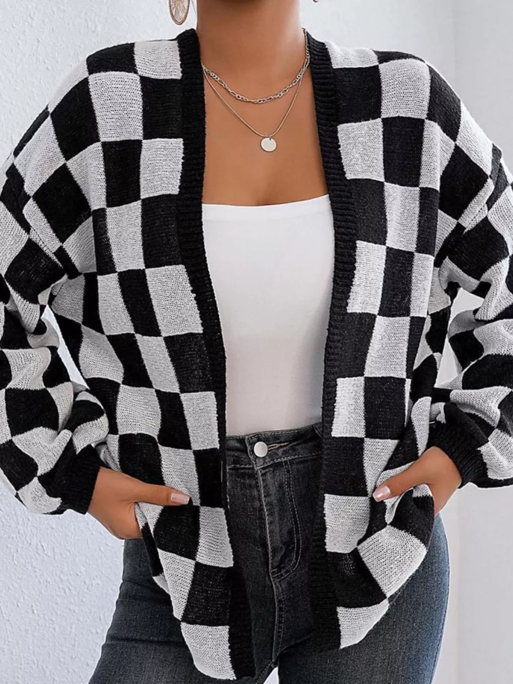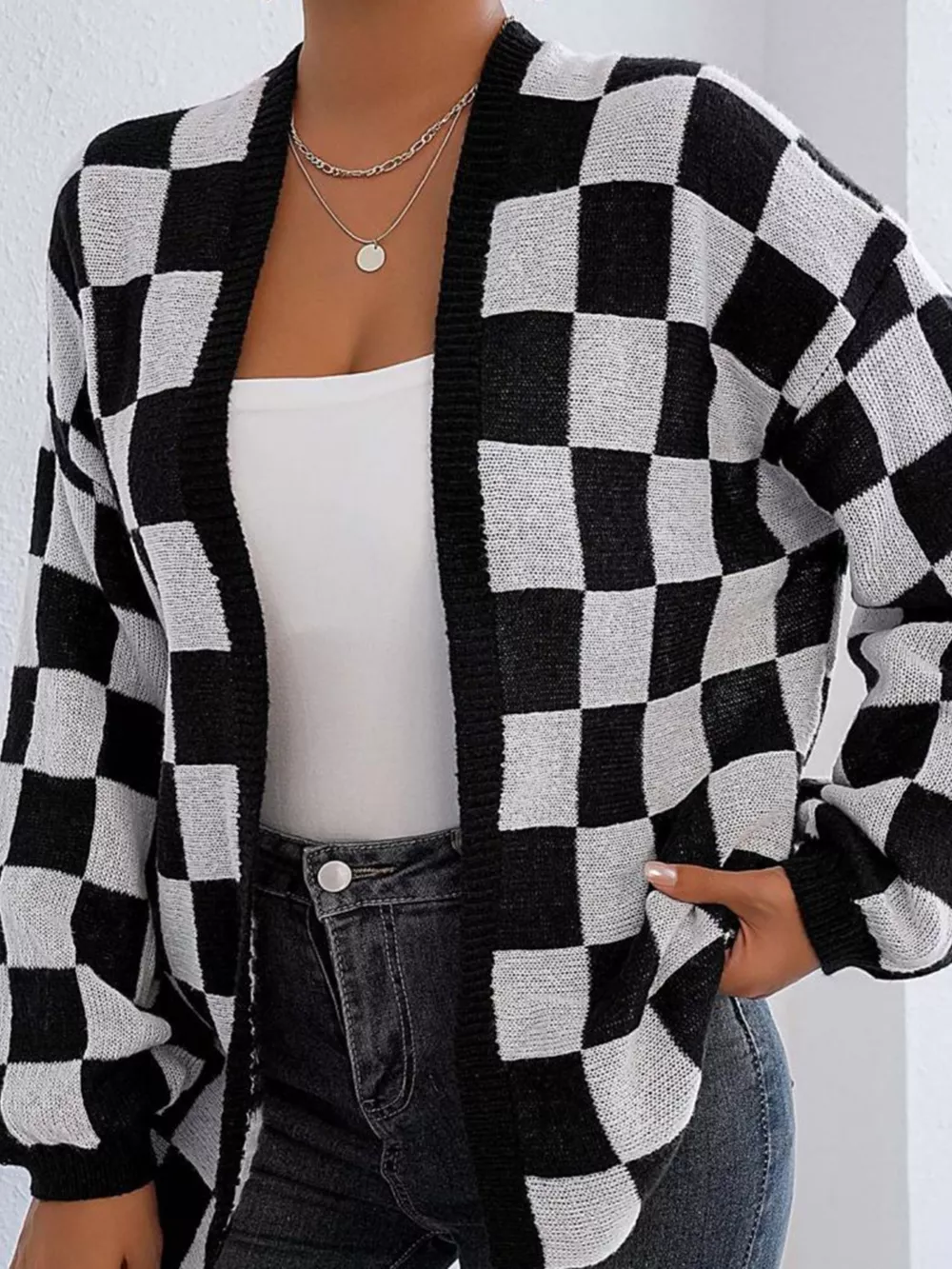 Checkerboard Pattern Open Front Knit Cardigan