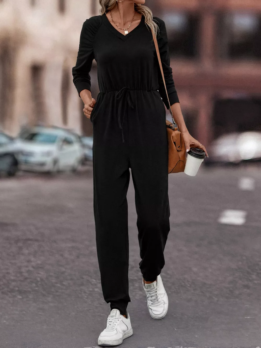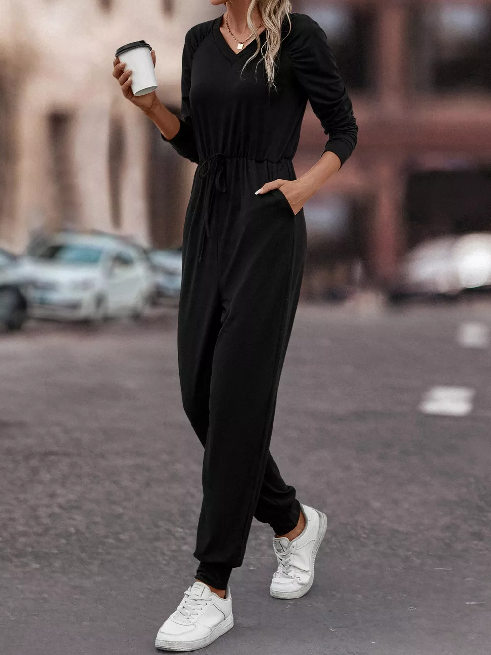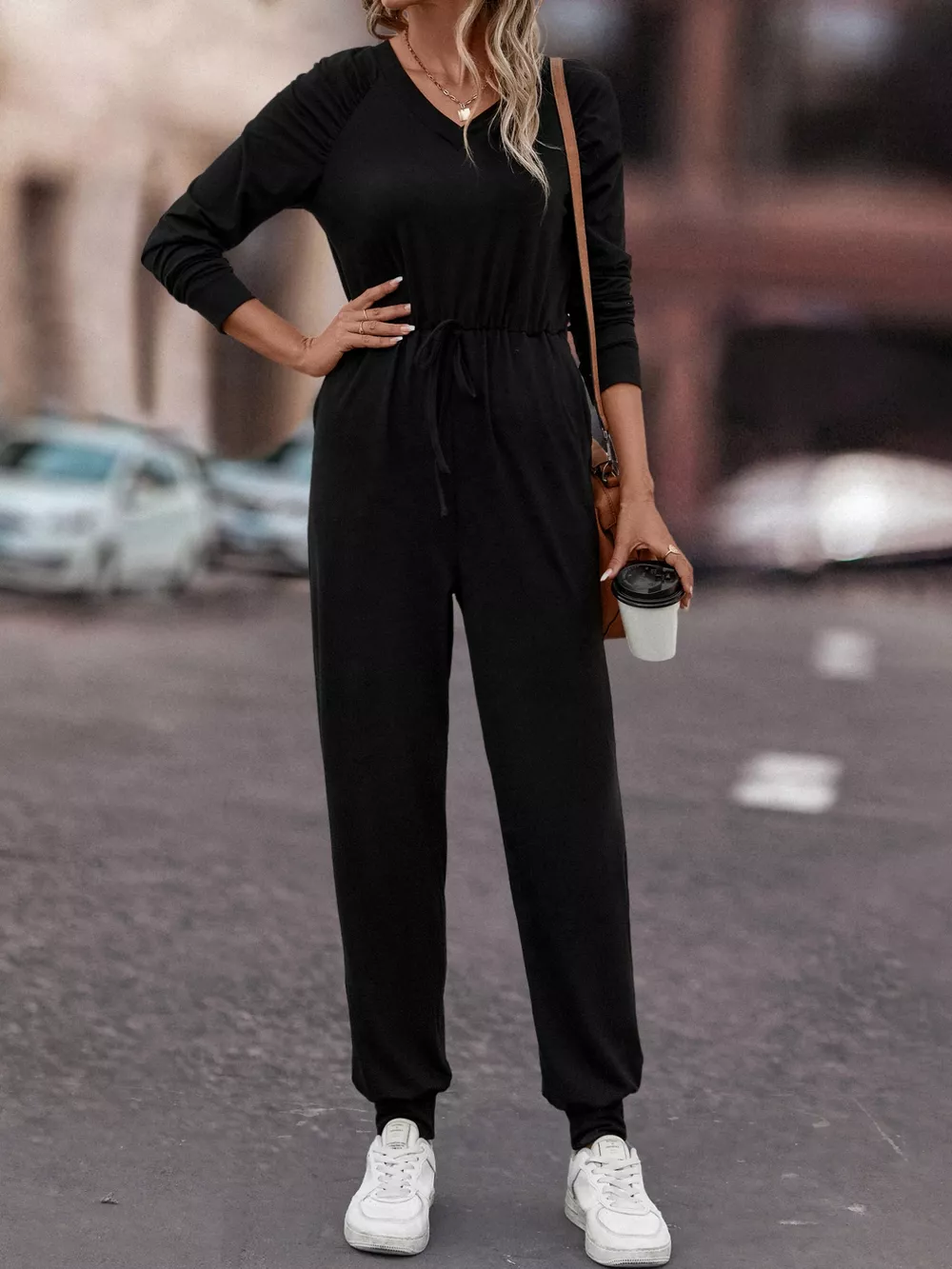 Casual Long Sleeve Drawstring Waist Jumpsuit
