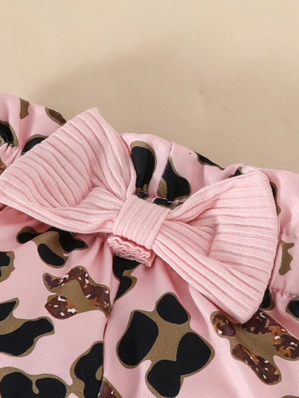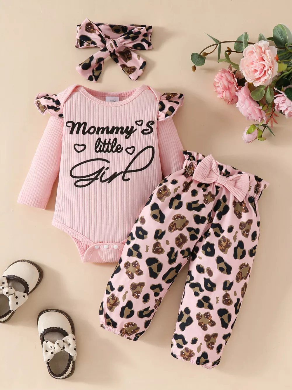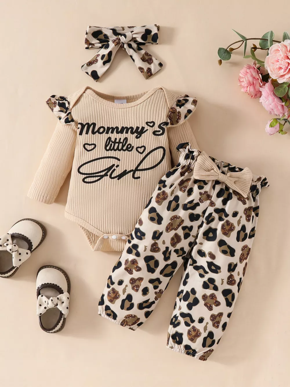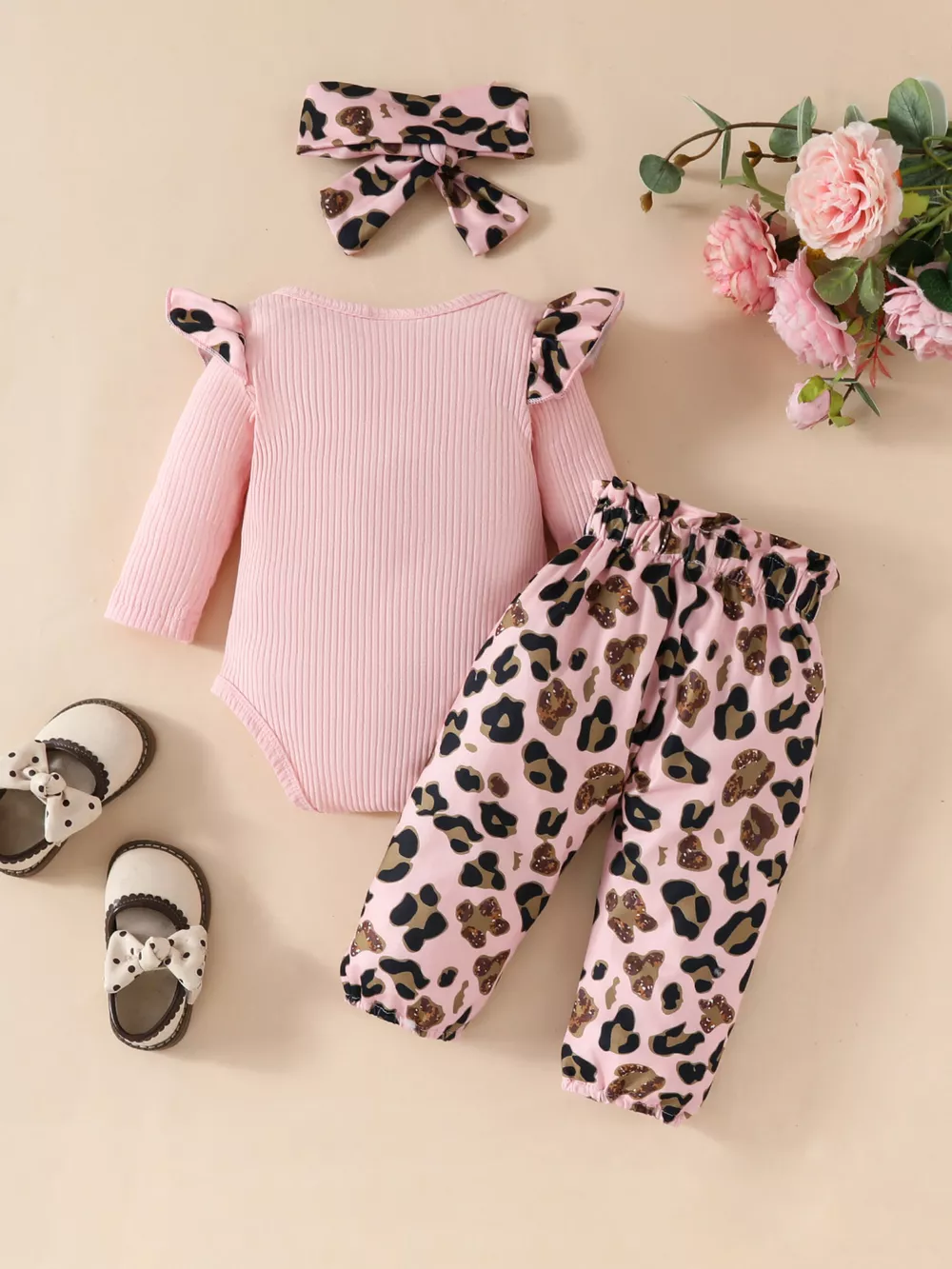 Children's Leopard Ruffled Bodysuit and Pants Set with Headband