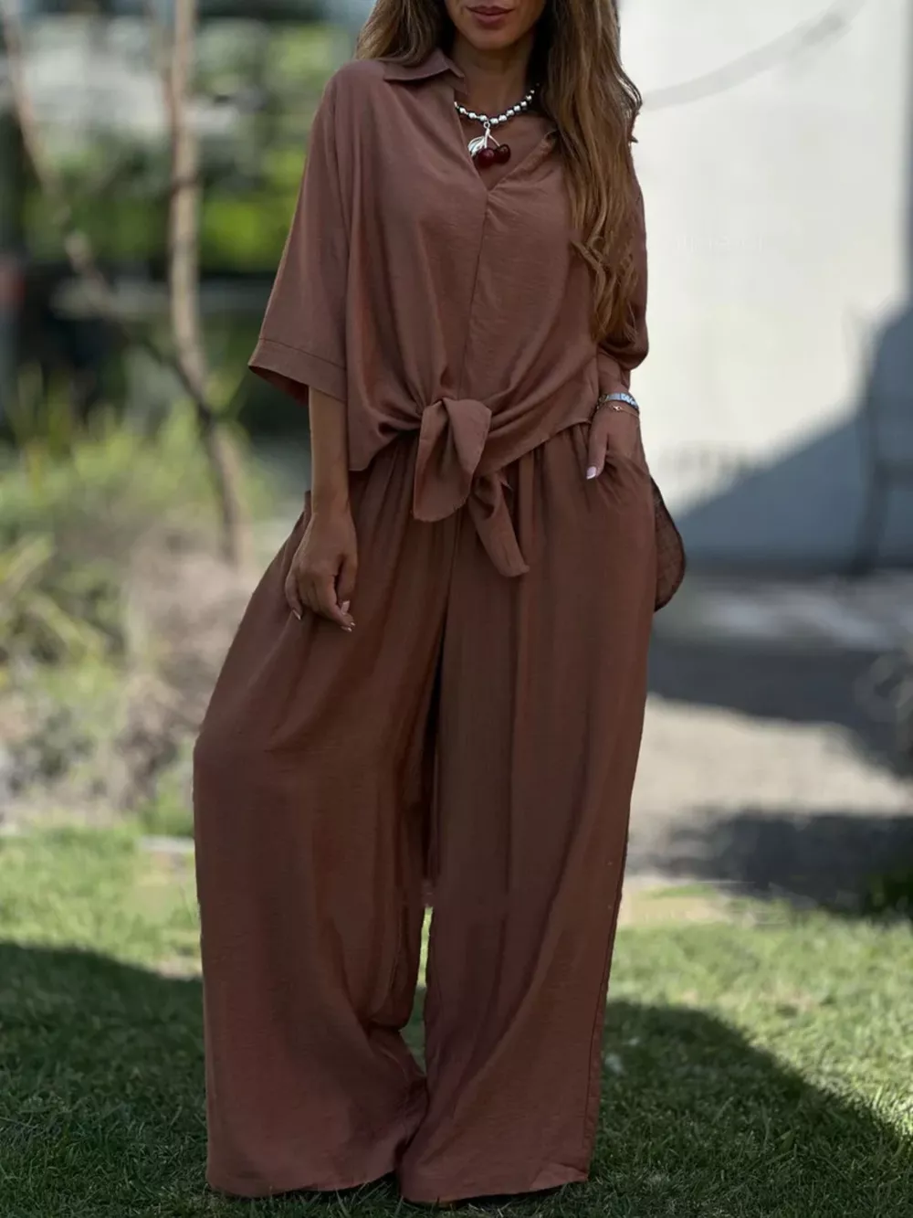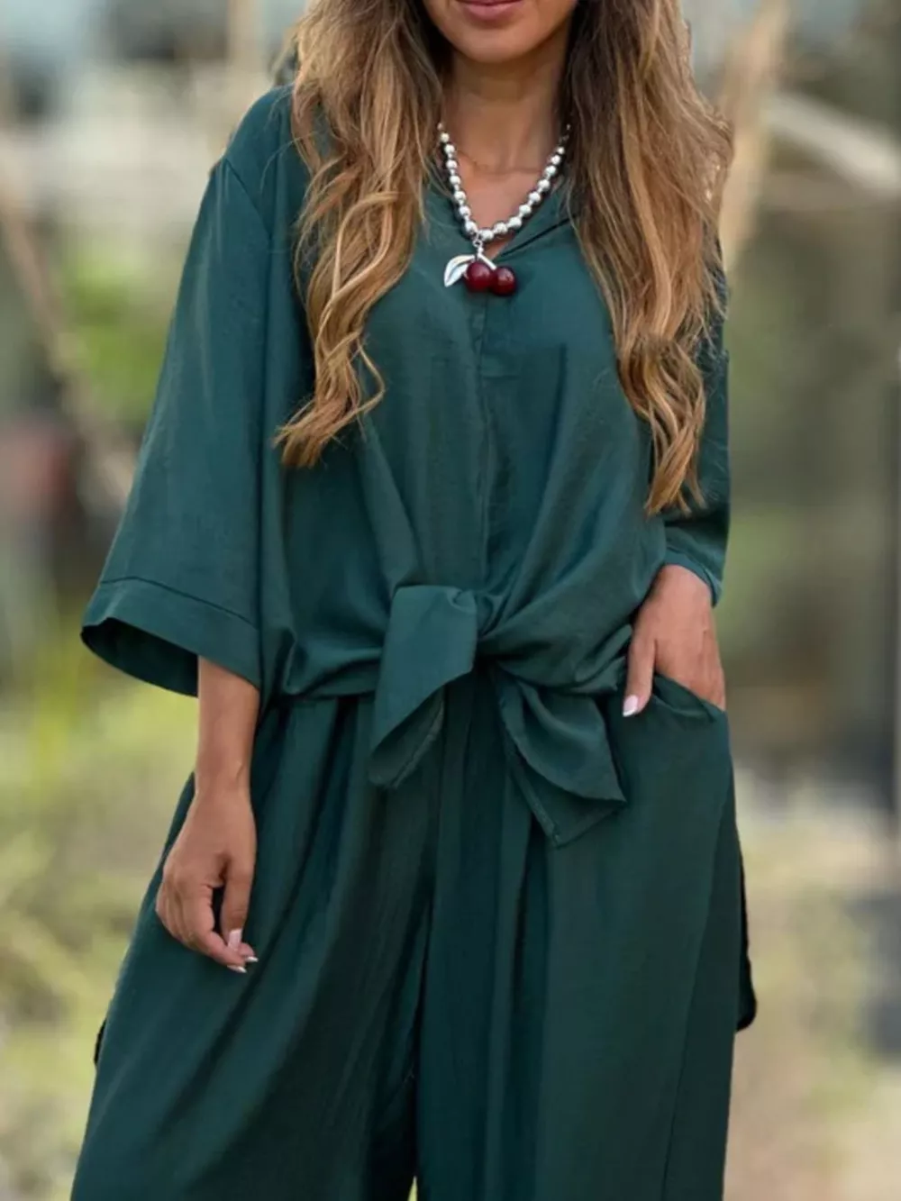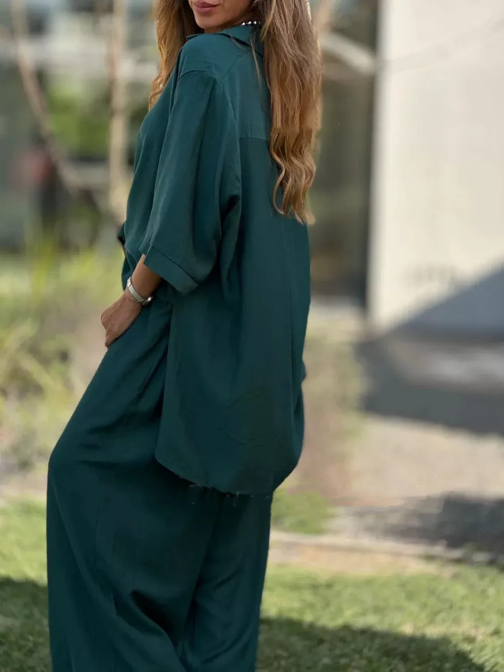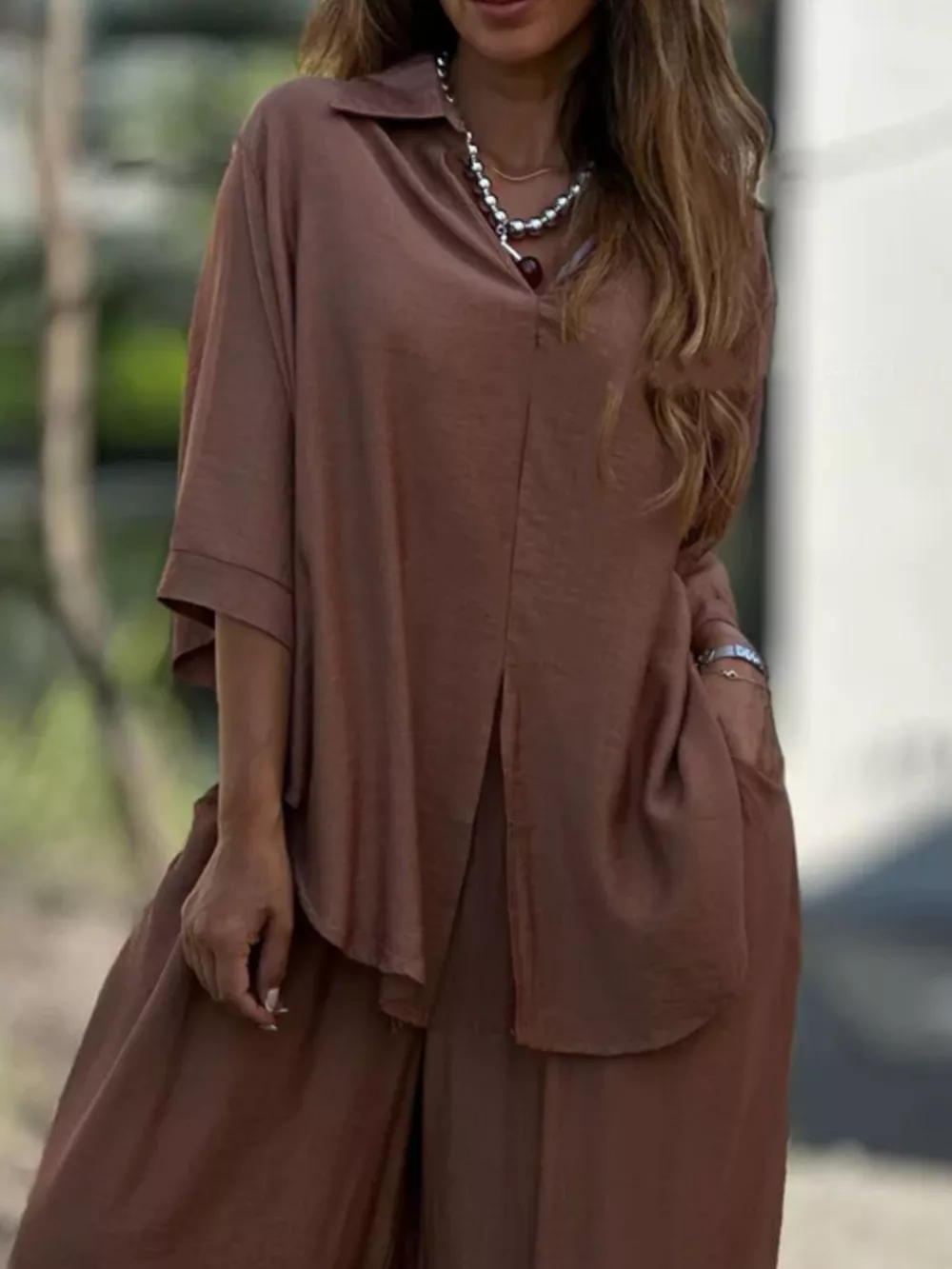 Full Size Collared Neck 3/4 Sleeve Top and Pants Set Plus Size