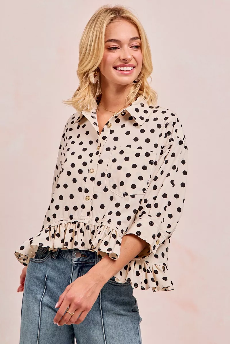 BiBi Polka Dot Printed Peplum Top with Front Button