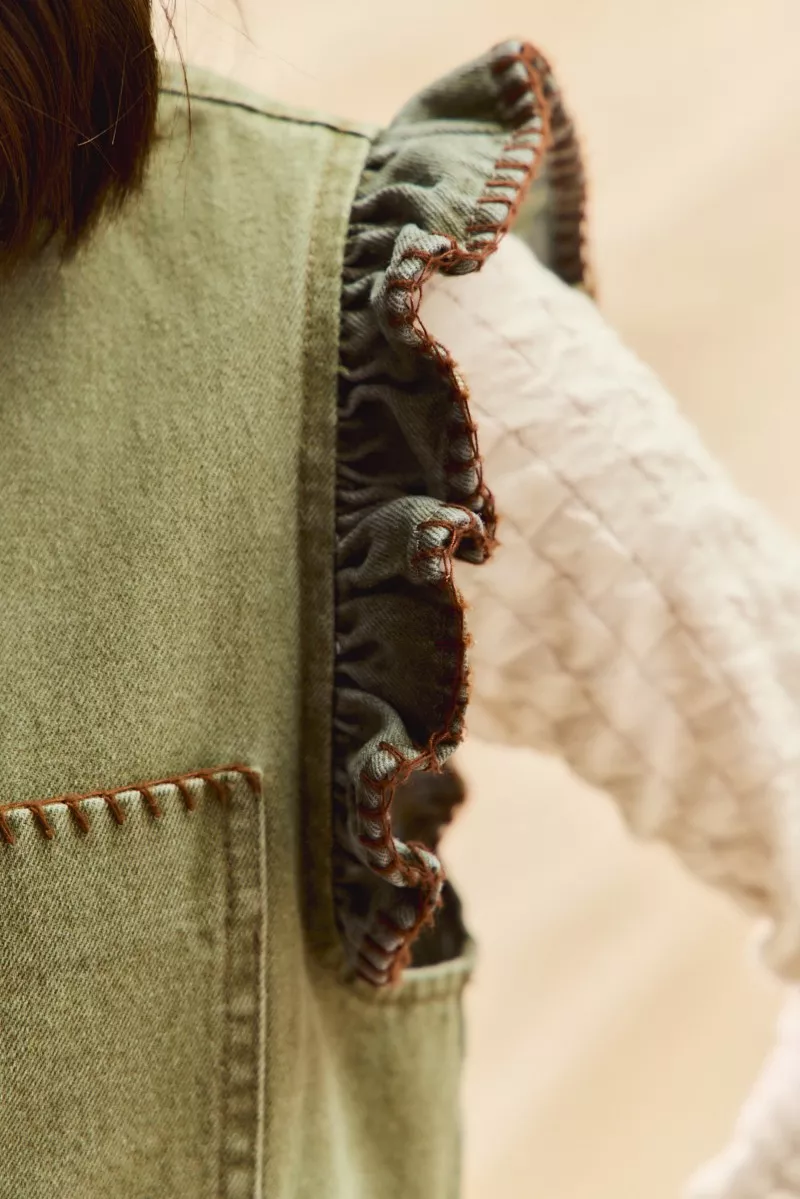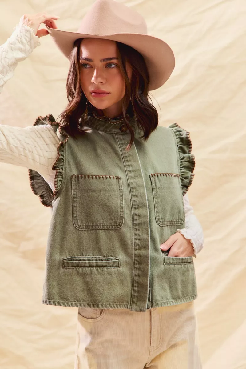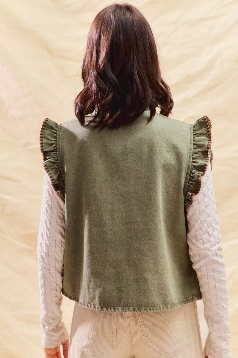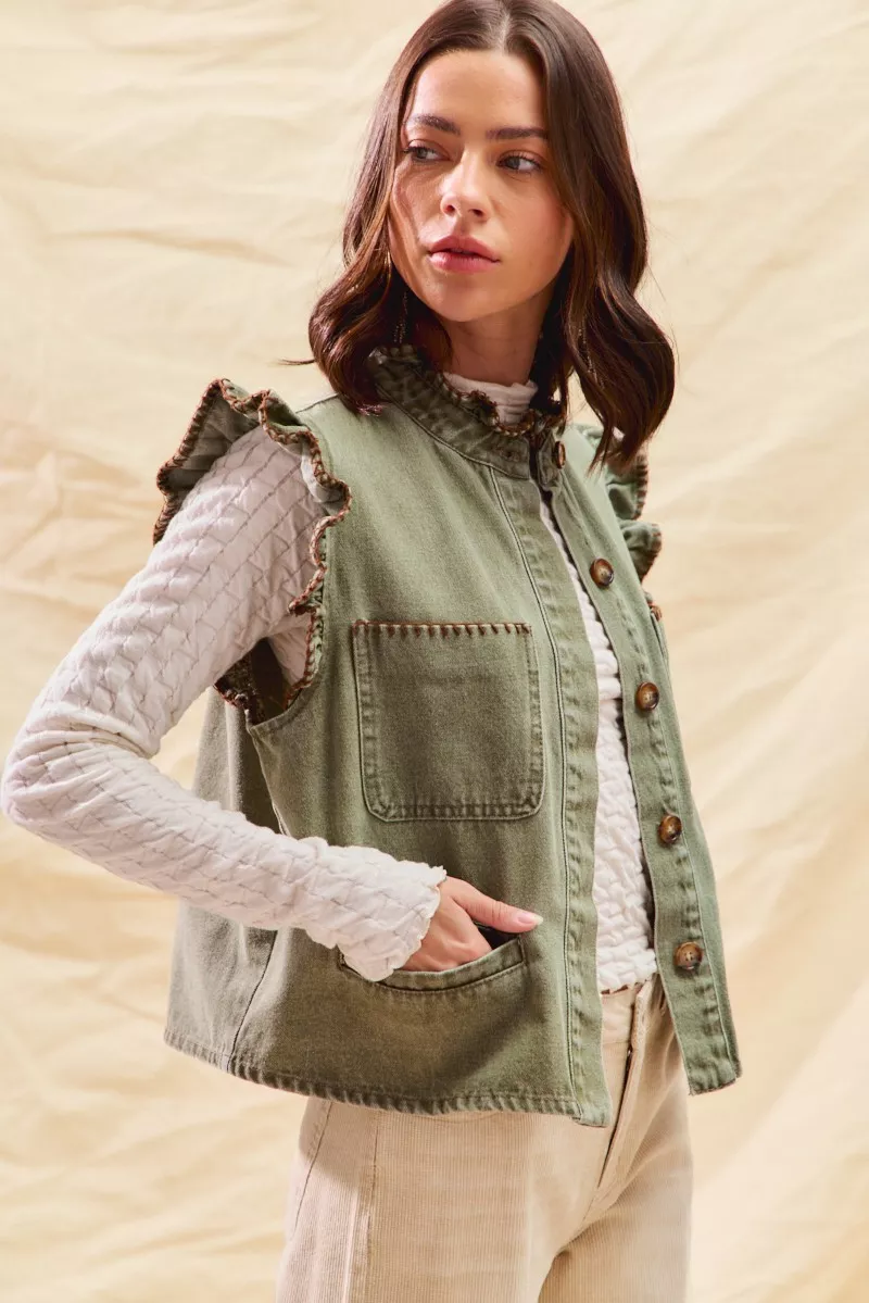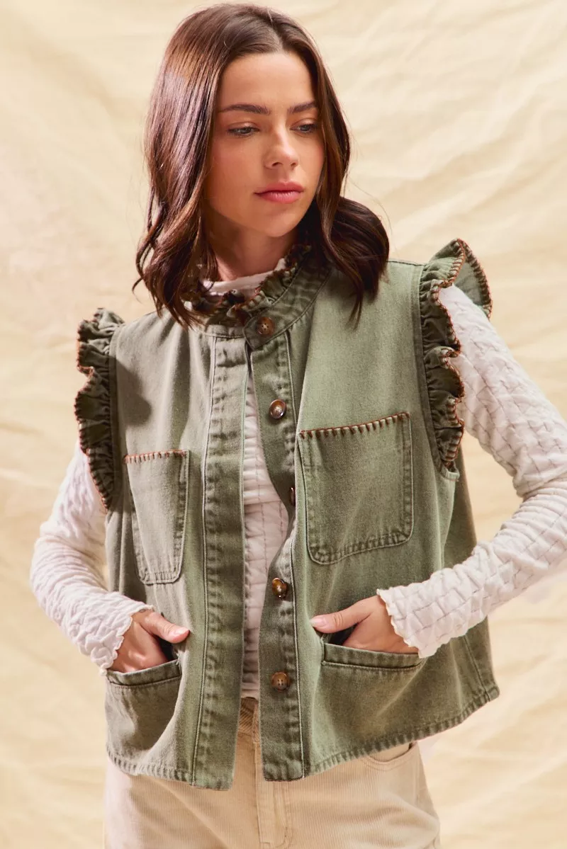 SO ME Washed Denim Stitch Ruffled Hidden Button Vest Top