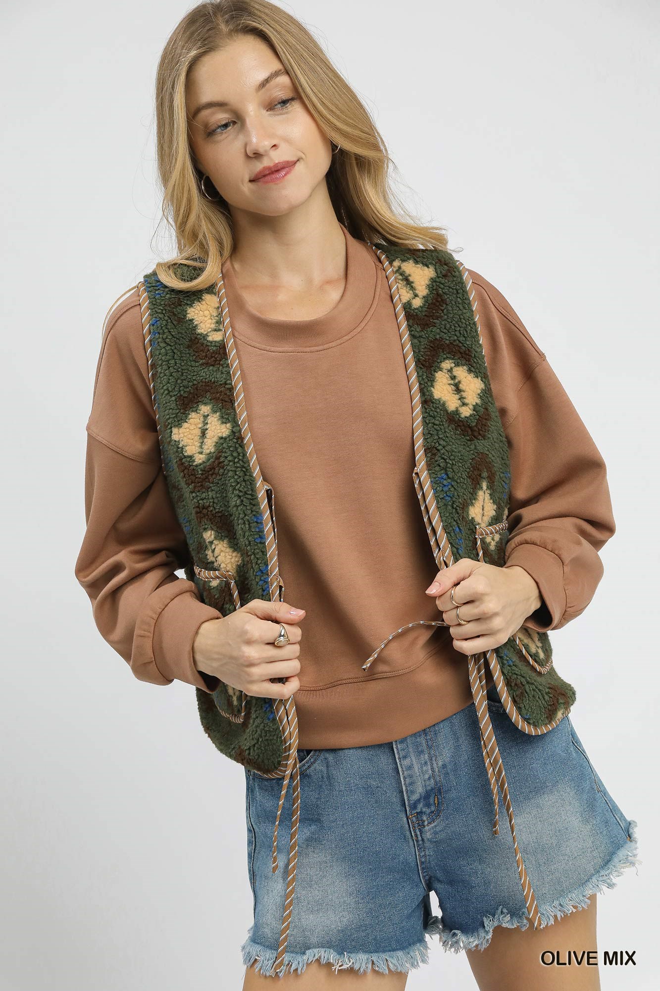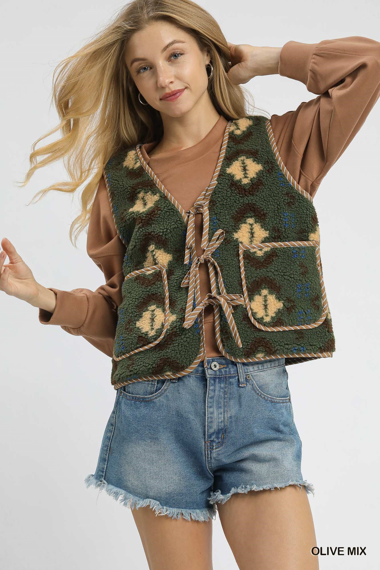 Umgee Mix Patterned Sherpa Tie-Front Vest