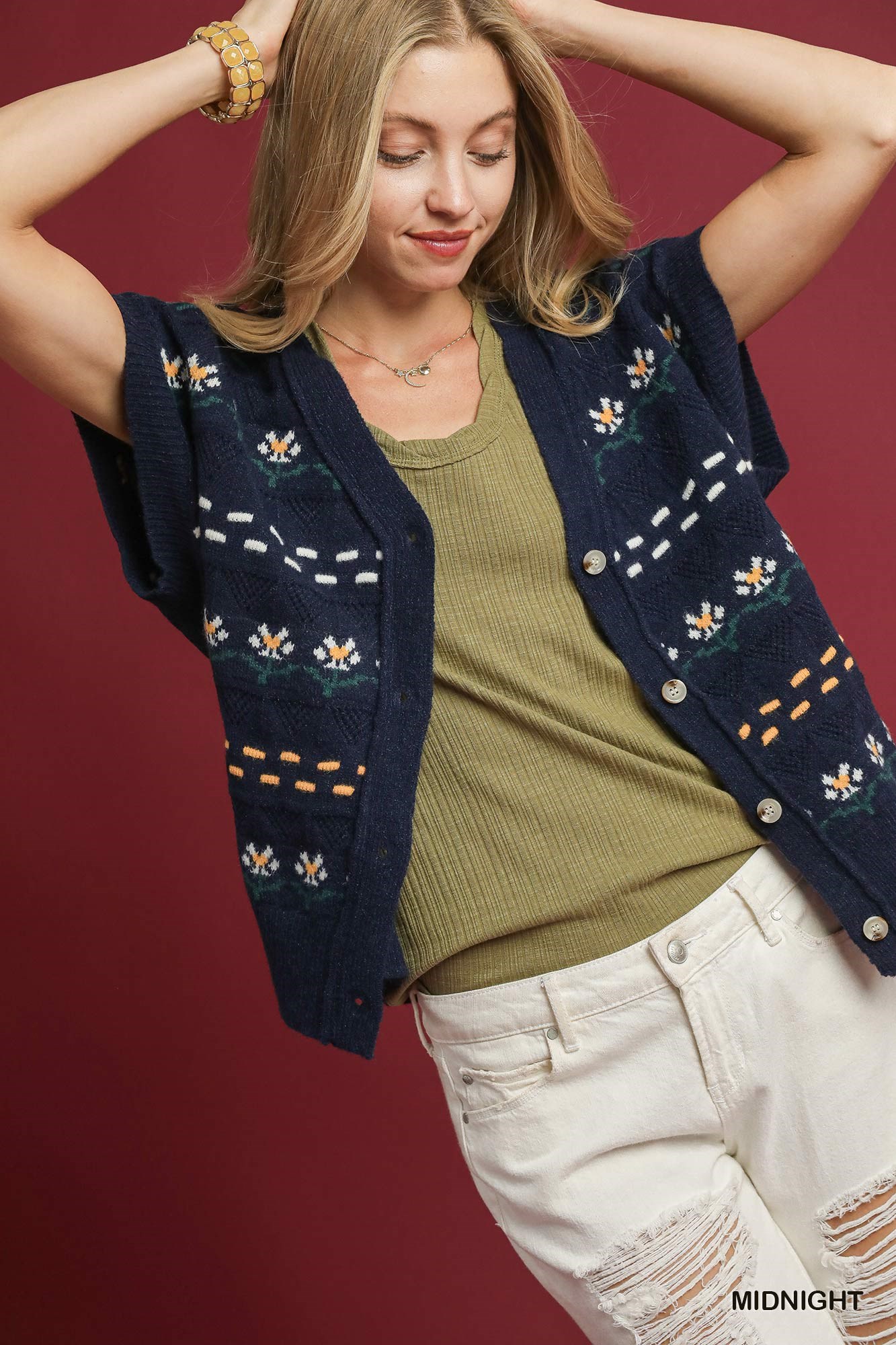 This button-down knit vest with a floral pattern features charming daisy motifs and stripe details for a whimsical look. The V-neckline adds a classic touch, while the front button-down style allows for easy wearing. With a sleeveless design and wide arm openings, this vest is both stylish and comfortable. Crafted from soft and cozy knit fabric, it's perfect for layering on cooler days. Please note that this vest is not lined, making it breathable and versatile for styling.