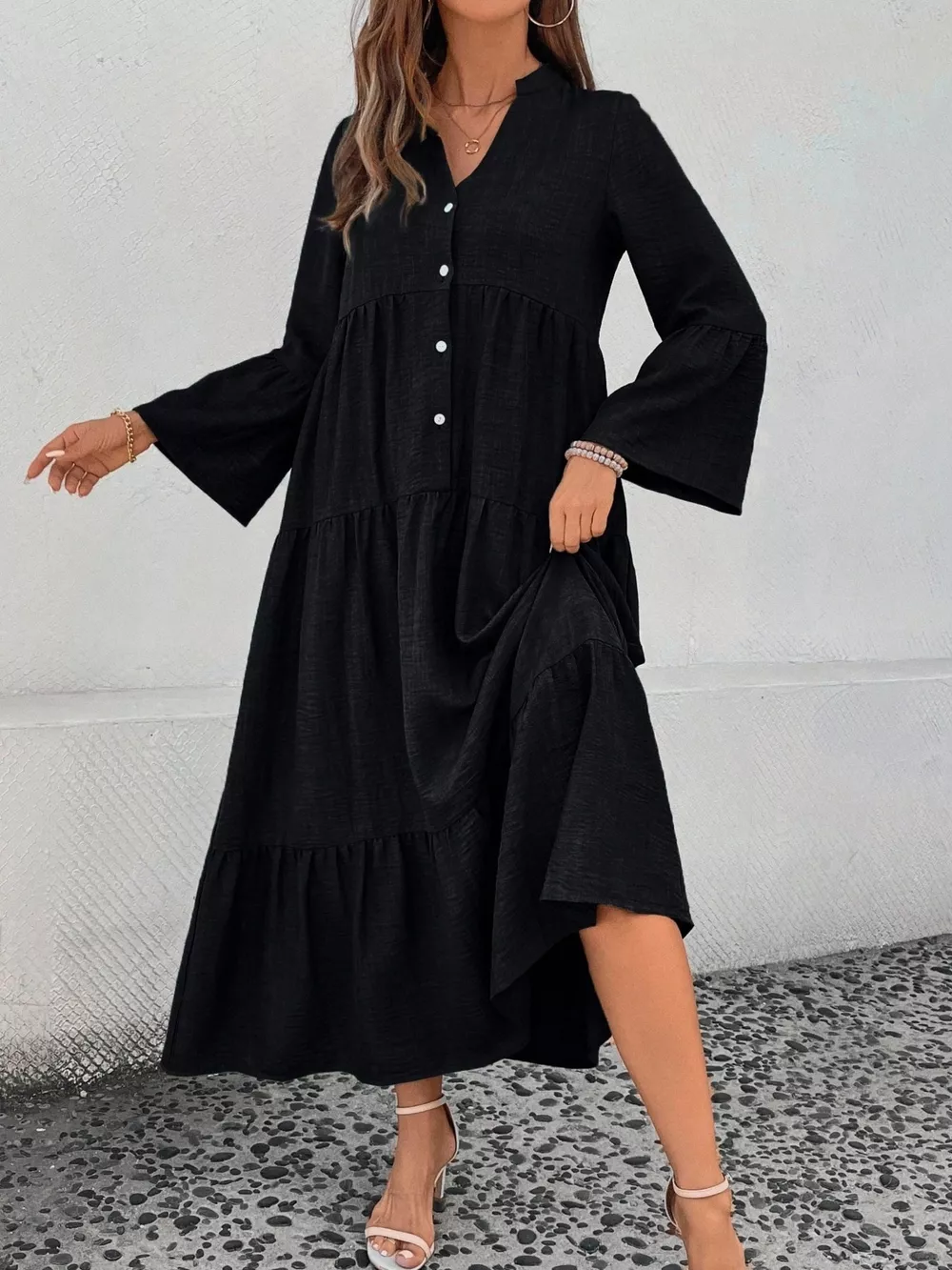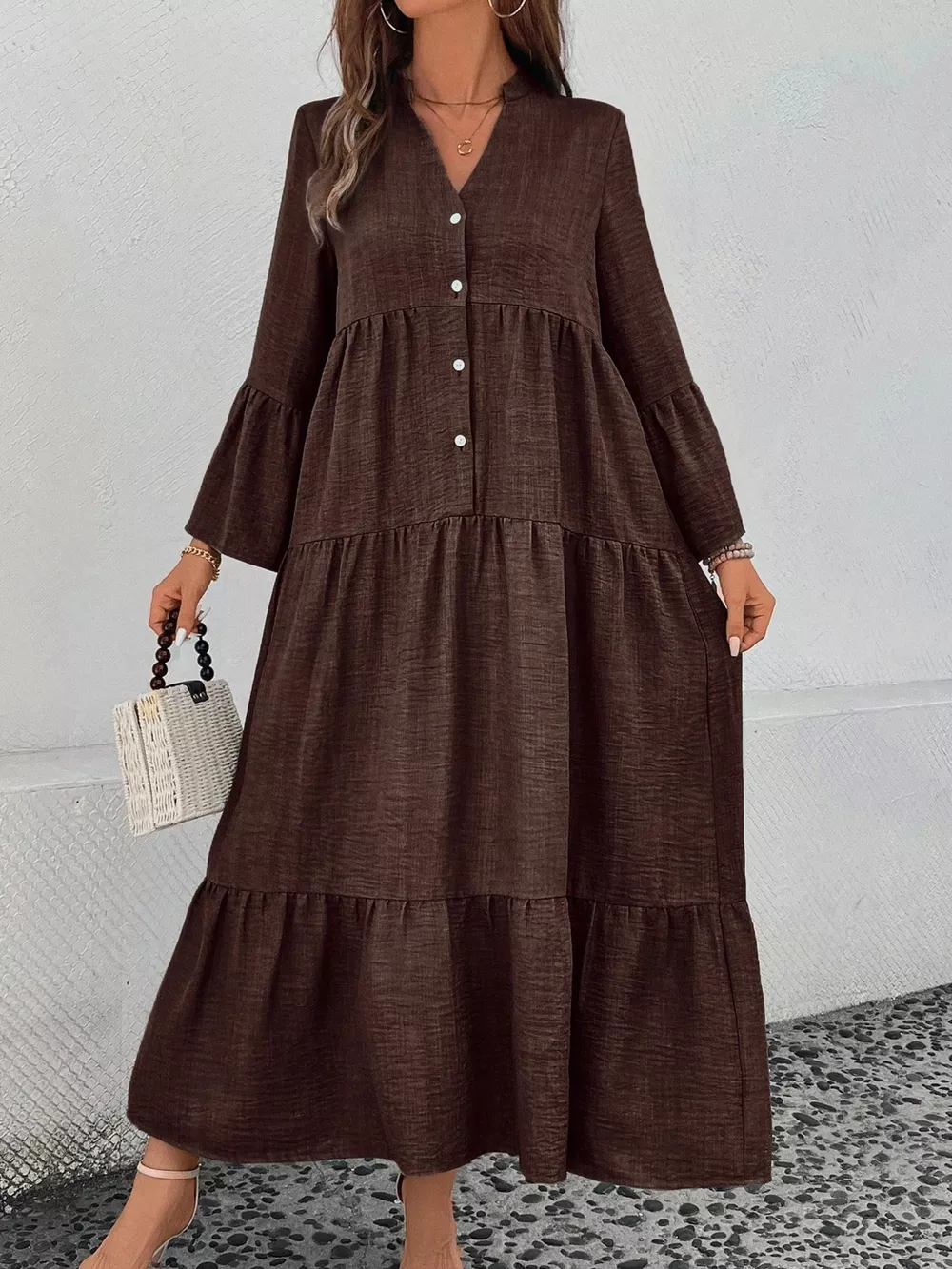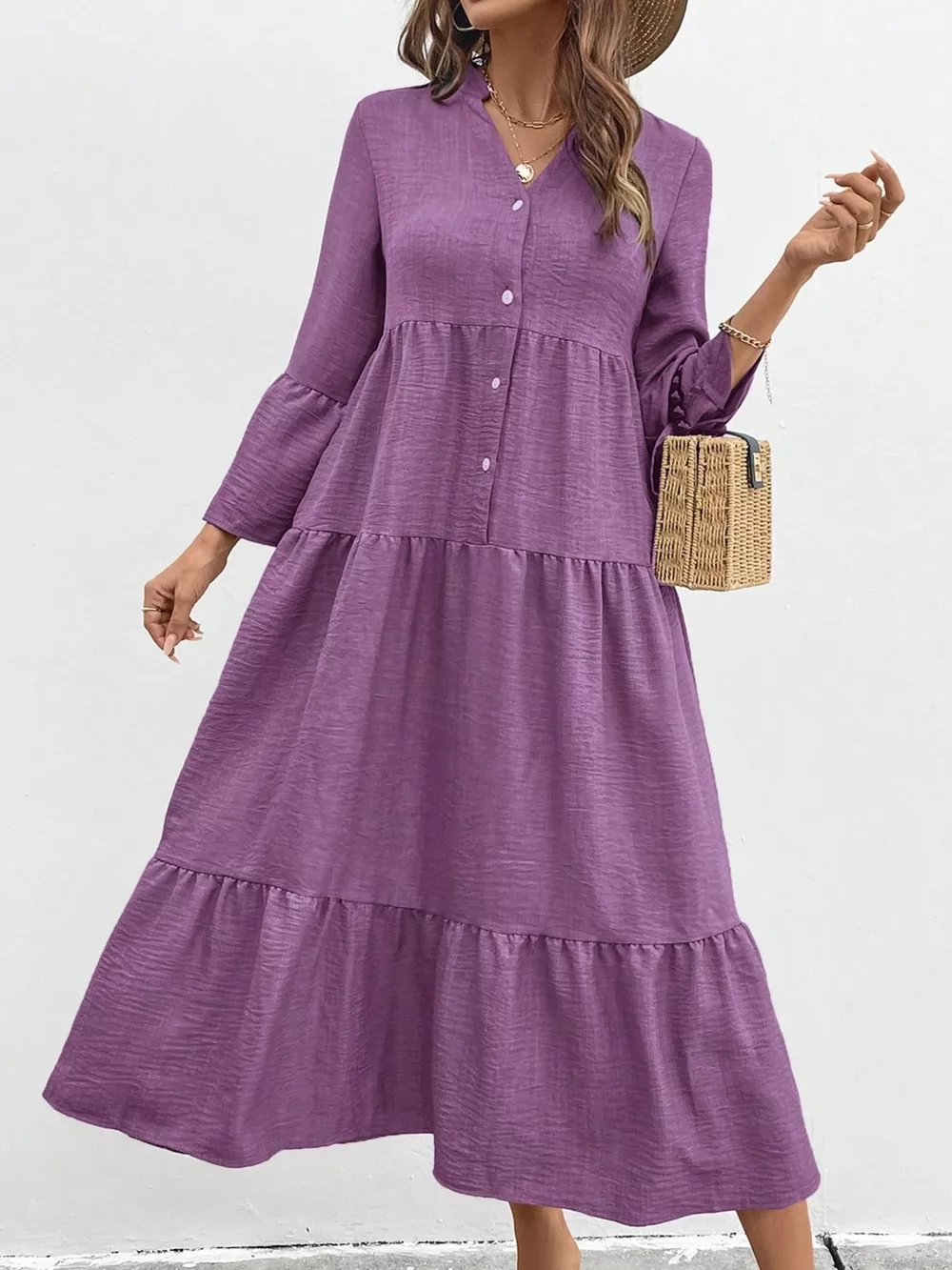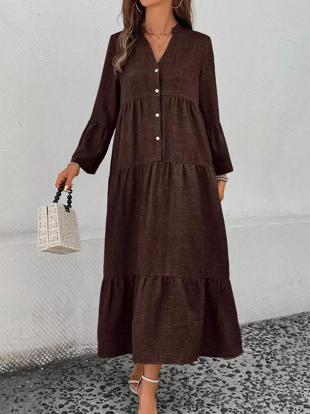Ruffle Hem Button Front Tiered Dress
