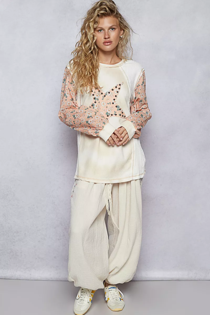 POL Exposed Seam Star Patch Thermal Top with Floral Sleeves