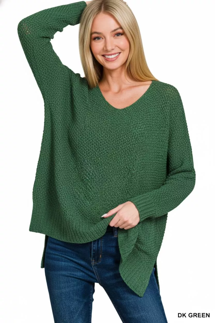 This stylish pullover sweater top features a flattering V-neck design and long sleeves, perfect for layering or wearing on its own. The textured knit fabric adds a touch of sophistication, while the relaxed fit ensures all-day comfort. Made from a soft and durable material, this pullover is a versatile addition to any wardrobe. Its easy-to-wear style makes it ideal for casual outings or dressing up for a more polished look. The dark green color enhances its appeal, making it a fashion and fashionable choice.