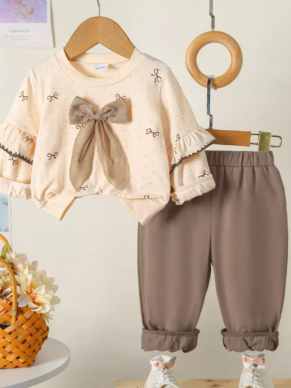 Children's Bowknot Ruffle Sleeve Top and Pants Set