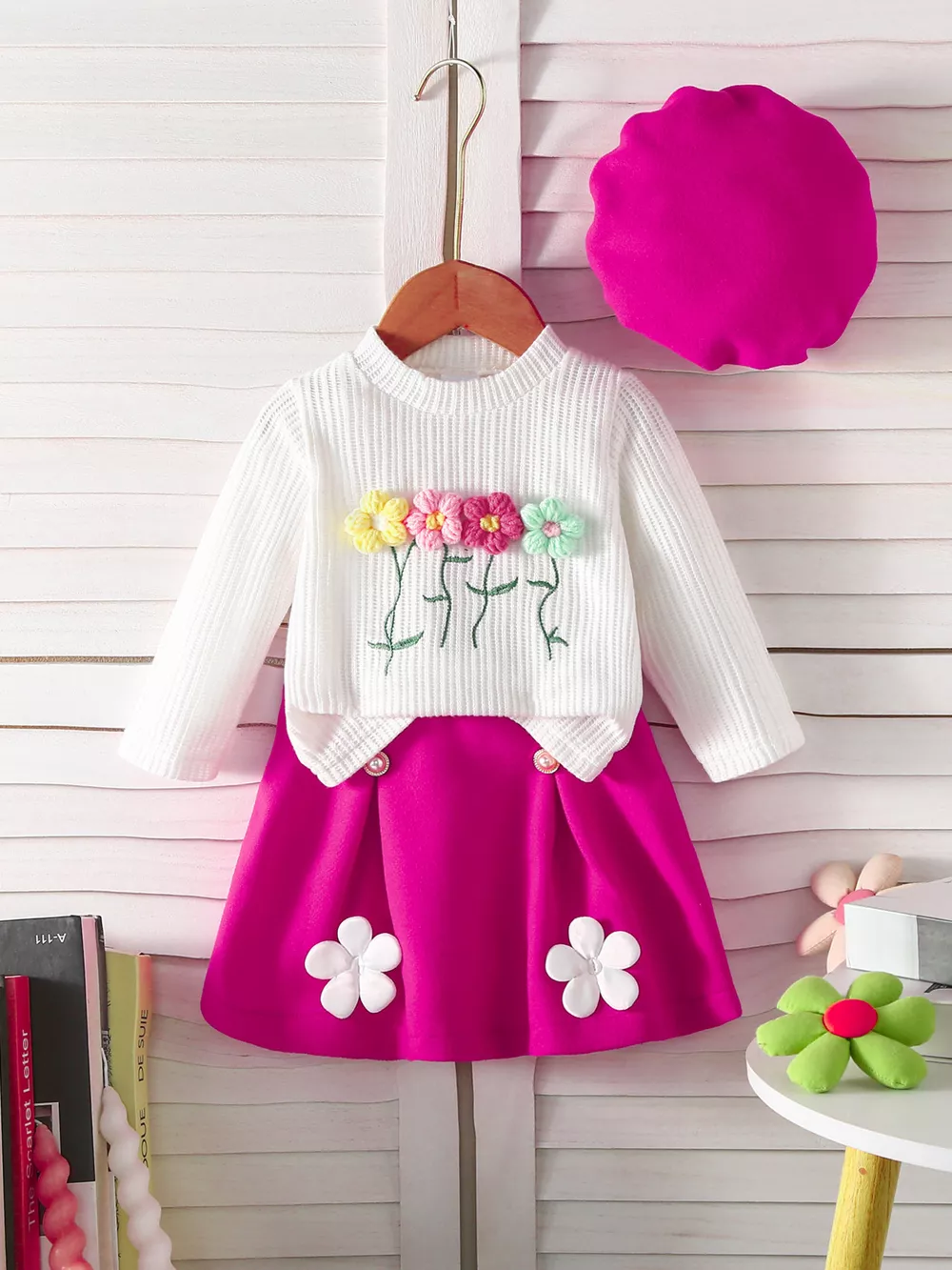 Children's Floral Applique Ribbed Knit Top & Pleated Skirt Set with Hat