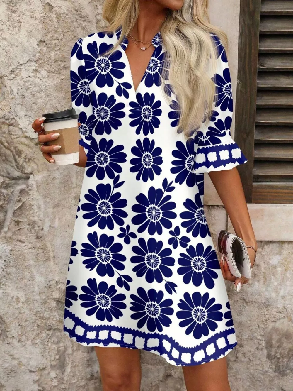Floral Print Notched Ruffle Sleeve Mini Dress