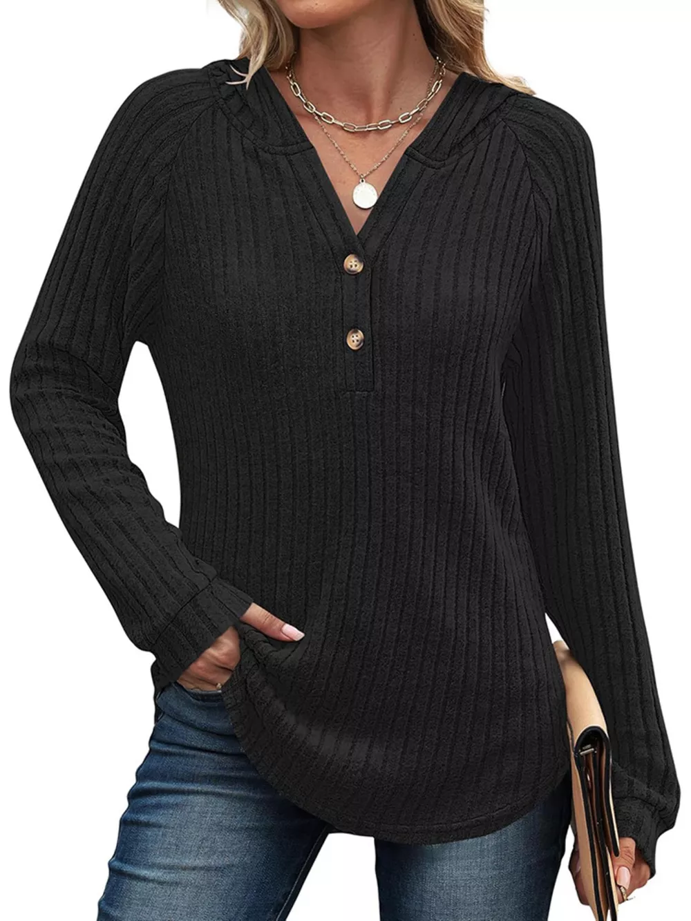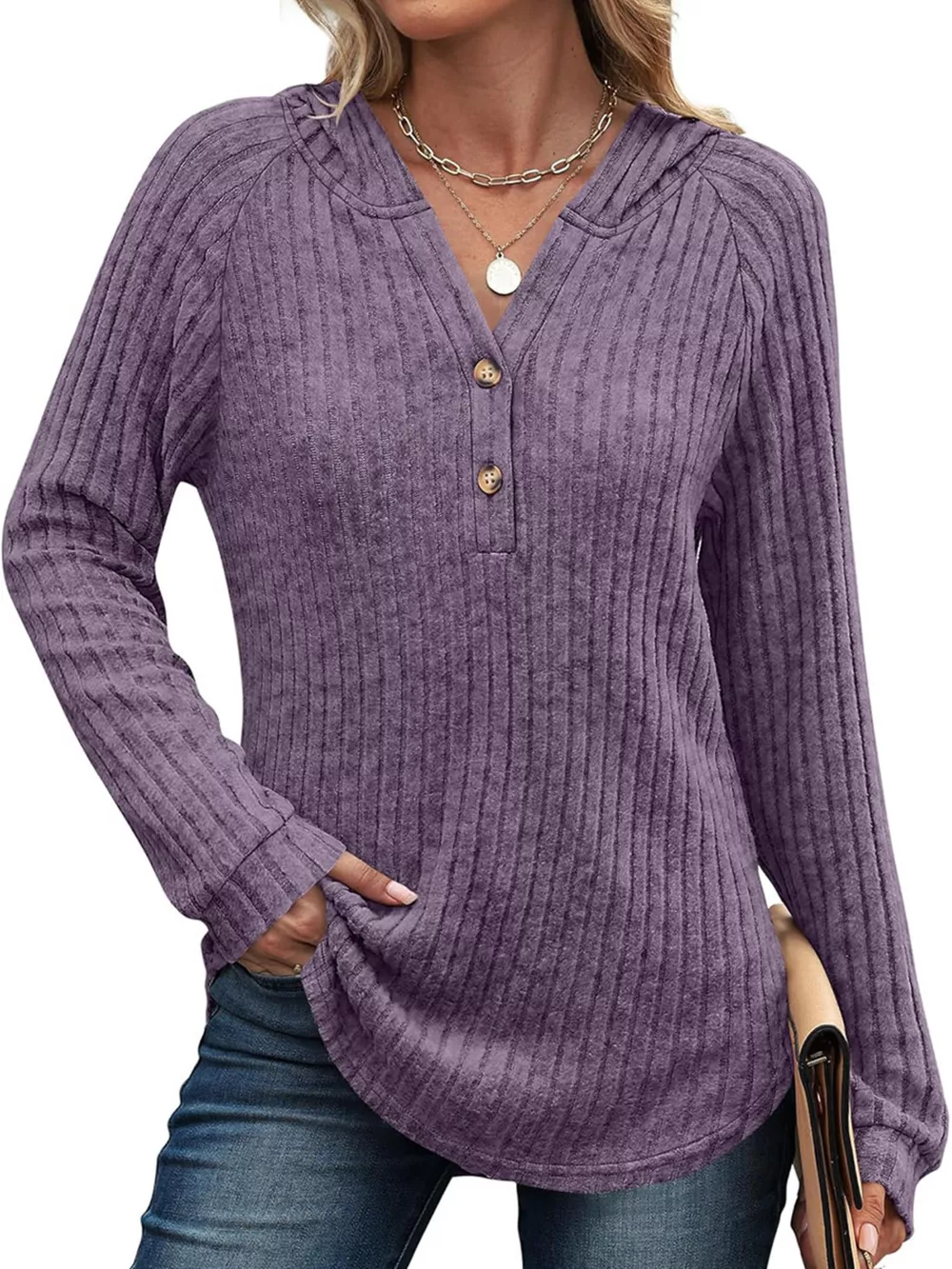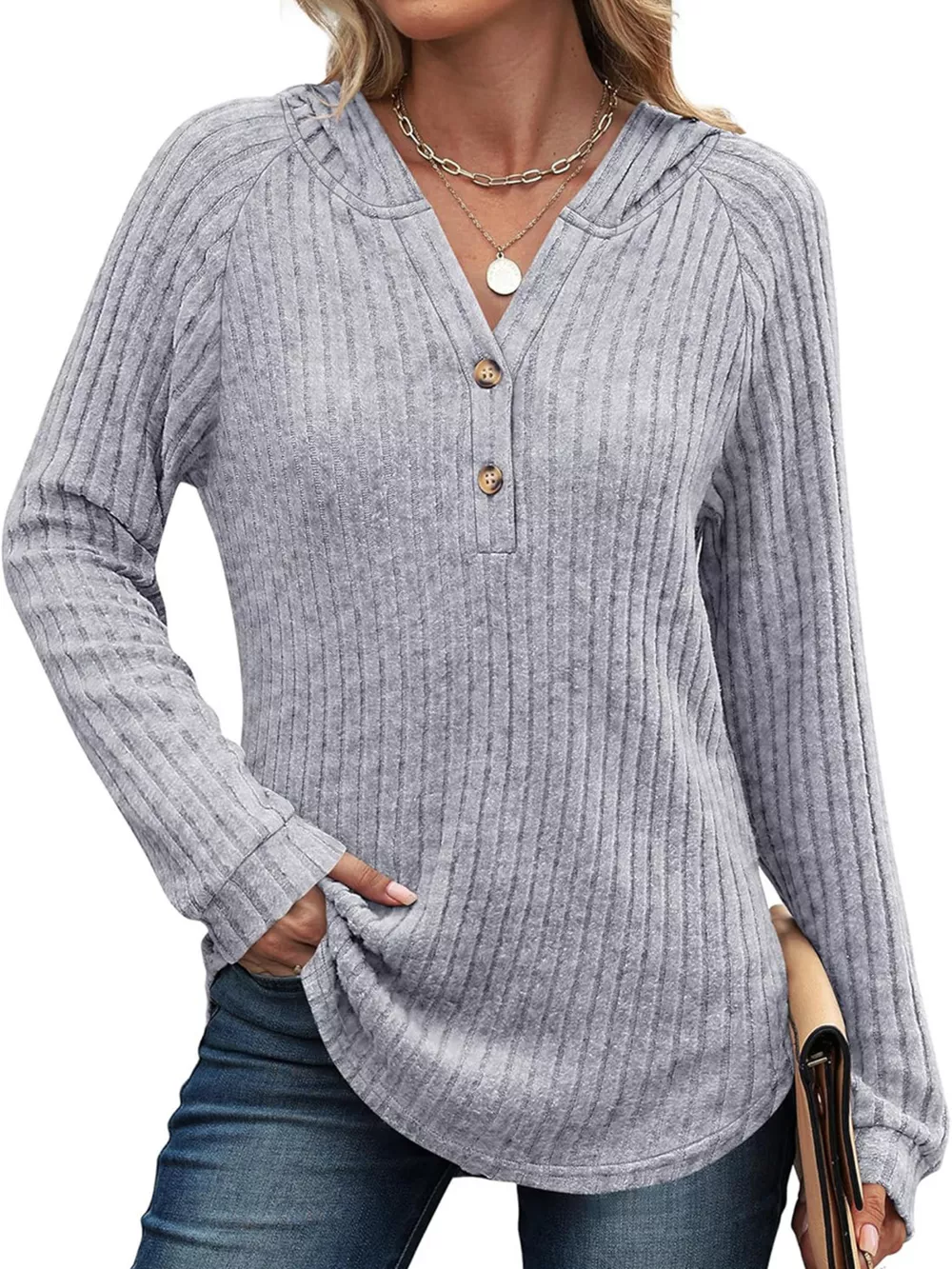 Full Size Ribbed Knit Button Detail Hooded Top Plus Size