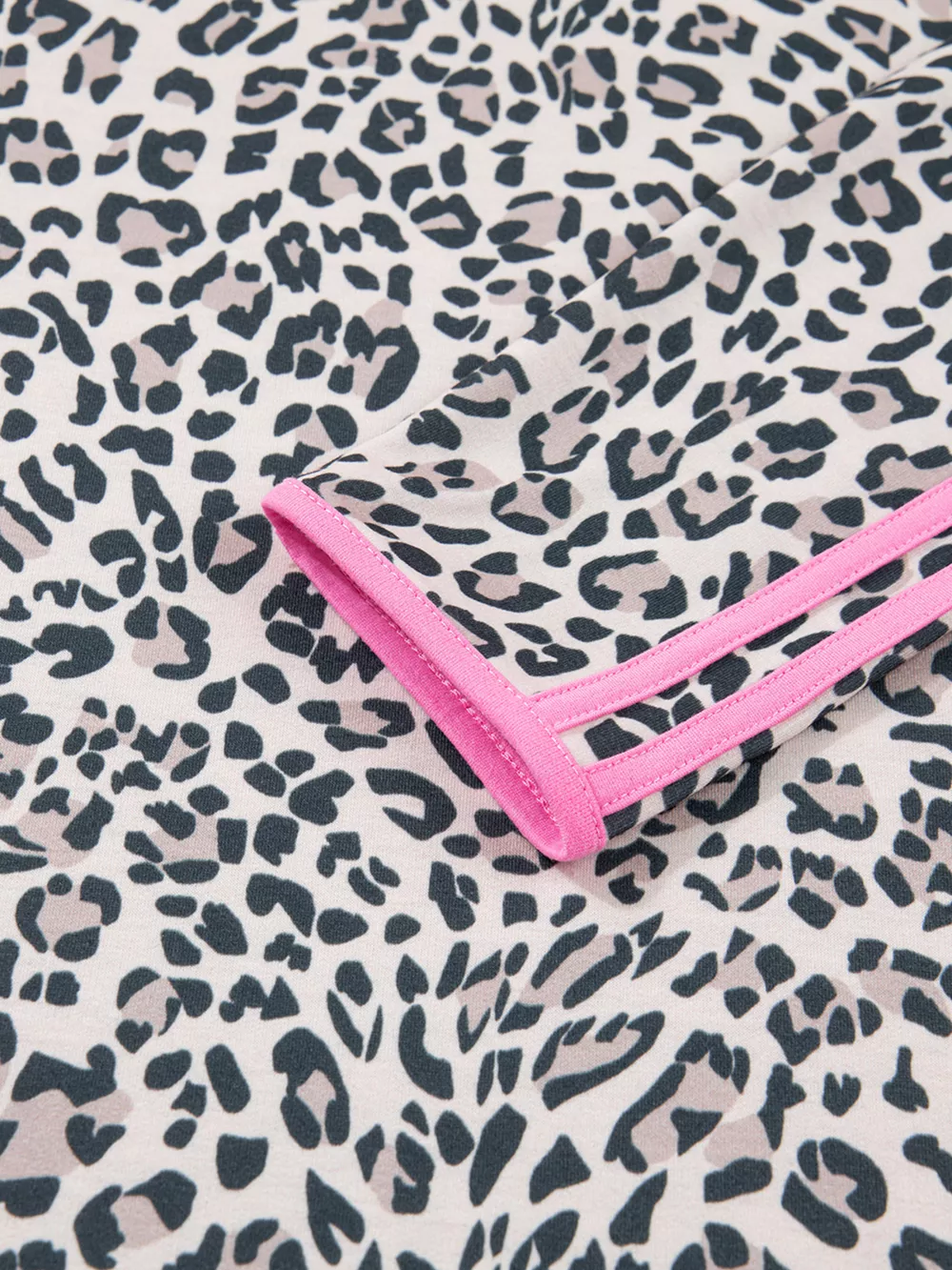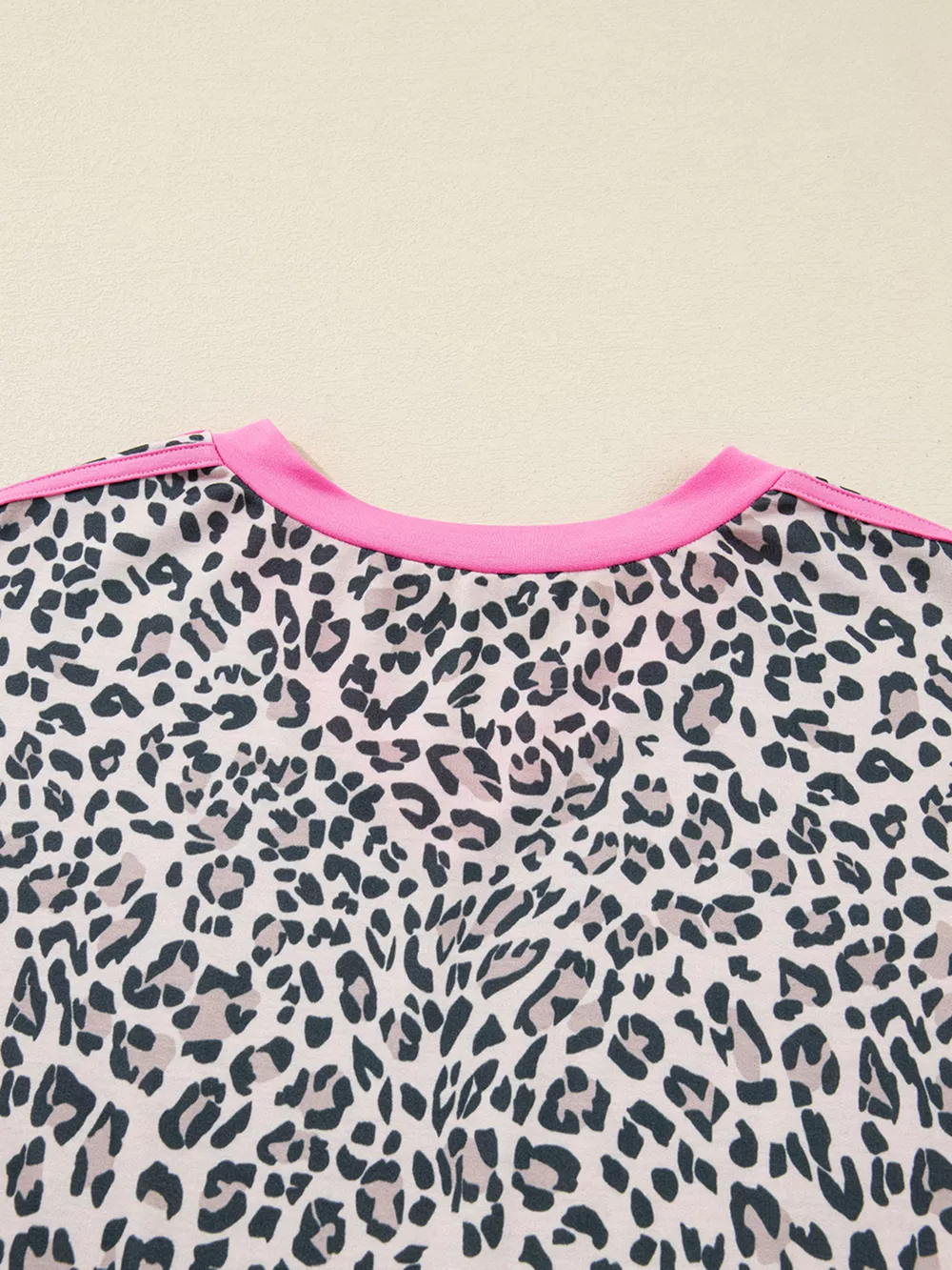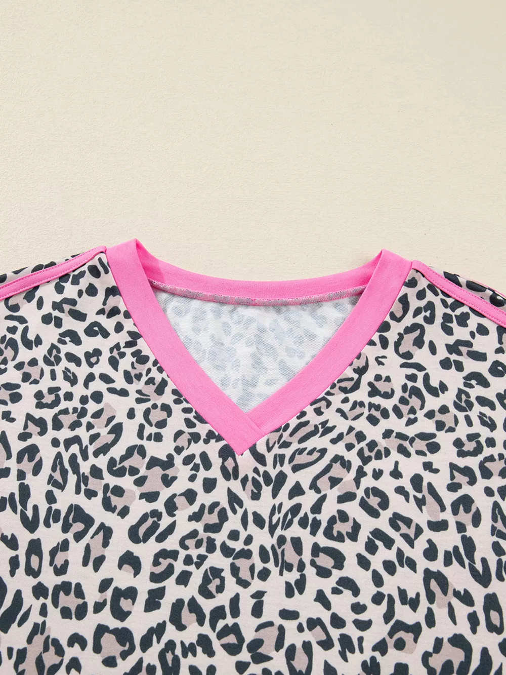 Leopard Print Contrast V Neck Varsity Stripe Detail Long Sleeve Top